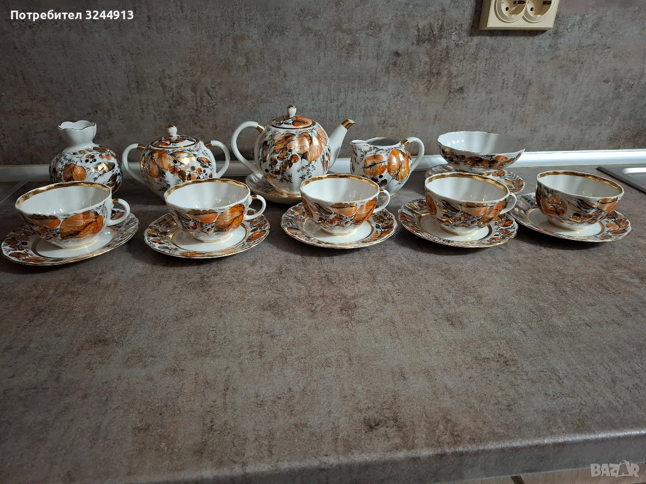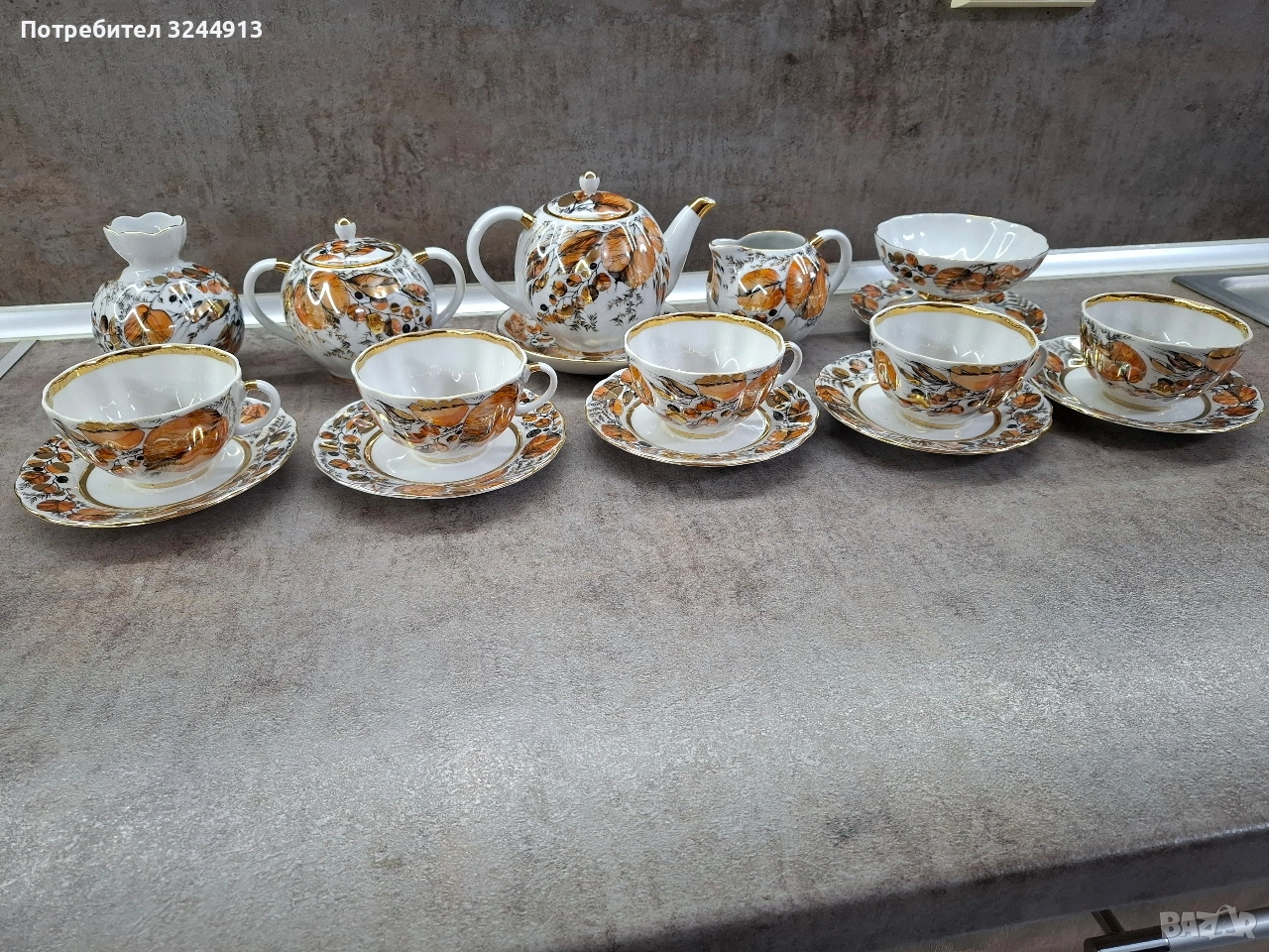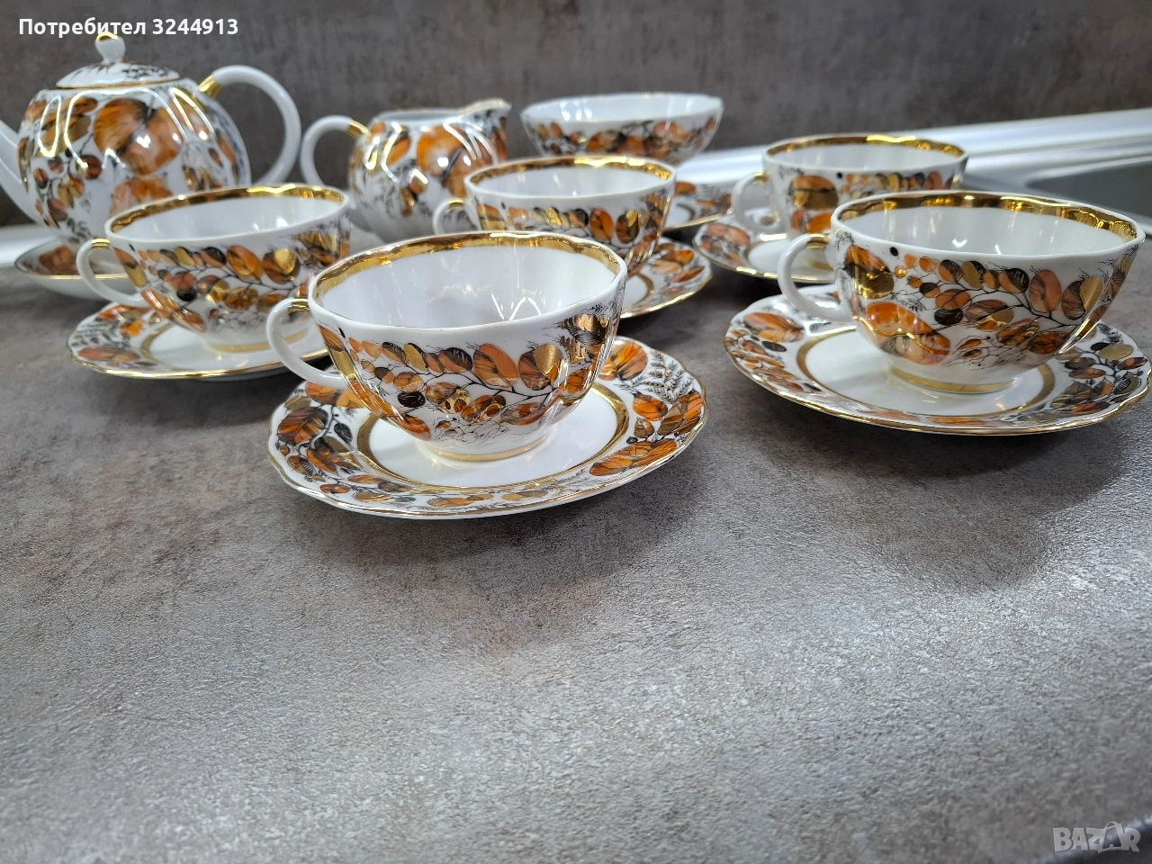 Изключително рядък Руски порцеланов чаен сервиз ЛФЗ ,, Мой сад" ( или познат като ,, Золотая осень") - рядкост като вид, и особено като състояние. Сервиза е стоял единствено в скрина за окраса , без изтриване на перлената боя и златото.По дъното на предметите - плътен златен кант, червено клеймо на дъното виж снимките. Съдържа: 5 чашки с форма ,,лале" 220мл. Чайник, Захарница, Латиера, Ваза, Бонбониера на столче. Цена 400€ . Изпращам с ЕКОНТ преглед . Моля разгледайте и другите ми предложения.