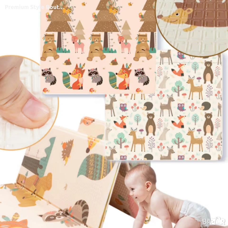 Технически характеристики на Двулицев образователен детски килим Горски животни 180 х 200 см - водоустойчив, сгъваем с високакачествена и безопасна мека пяна Размери разгънат: 180 x 200 см Размери сгънат в чанта с цип: 89 x 40 x 10 см (Д x В x Д) Материал: издръжлива, нетоксична пяна с водоустойчиво покритие Тип: двулицев, сгъваем, лесен за съхранение и пренасяне Повърхност: релефна за по-добро сцепление Подходящо за: бебета, малки деца, семейни занимания, пикник и пътувания Безопасност: не съдържа токсични вещества, съобразено за първите дни на детето Лесна поддръжка: избърсване с влажна кърпа