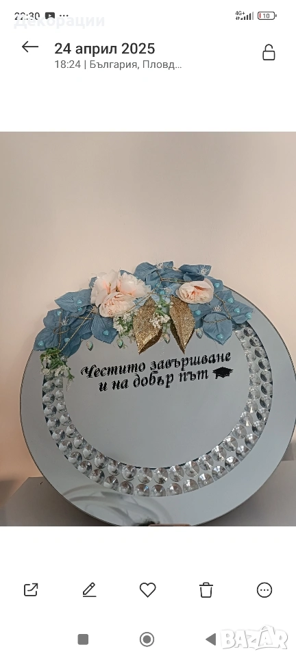 красиви ръчно декорирани с цветя огледални подноси за украса по масите за вашите специални поводи.Има и място за надпис ако желаете.Цена за брой 9 евро.Ползвани веднъж за два часа