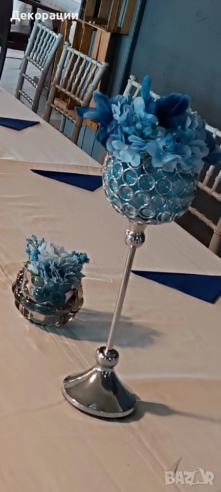 красиви свещници с камъни мъниста за украса на събития.Покзвани за два часа .Нови .Продават се без цветята.Височина 25 см.Цена за брой 5 евро.Има и малки от същата серия цена за брой 4 евро