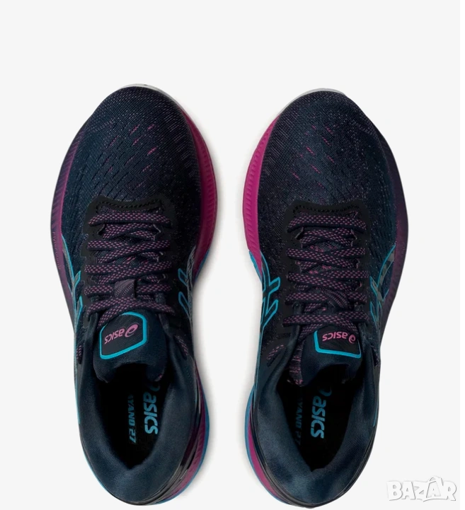 Asics GEL-KAYANO 27, популярен модел за бягане, специално разработен за жени. Тази цветова комбинация често се нарича French Blue/Digital Aqua.