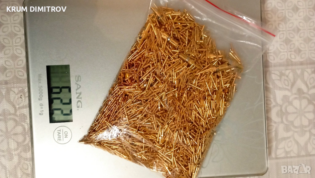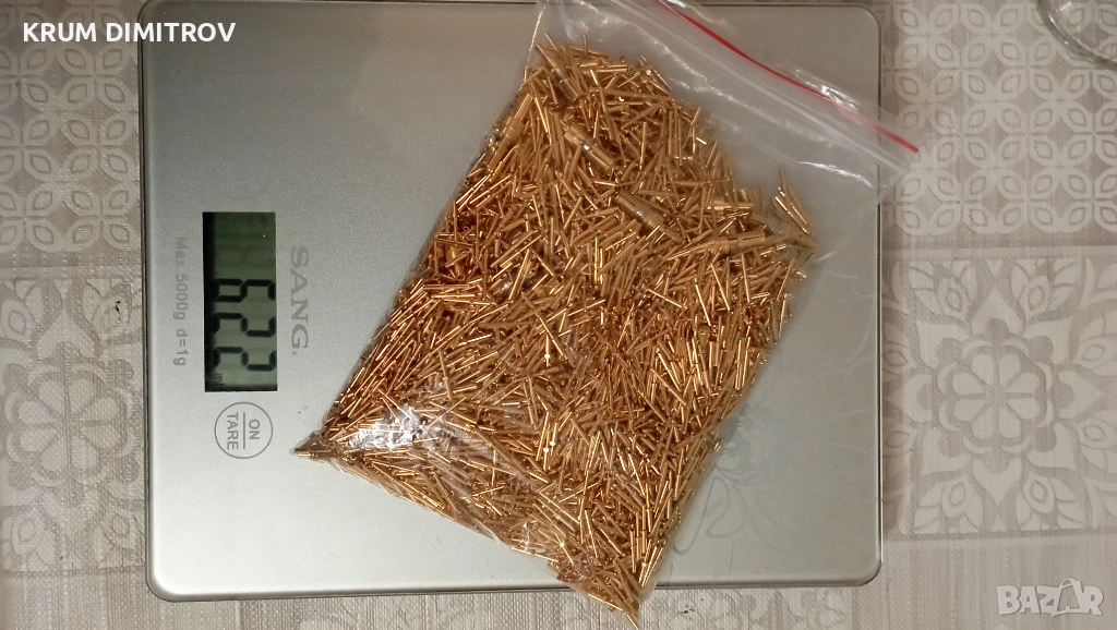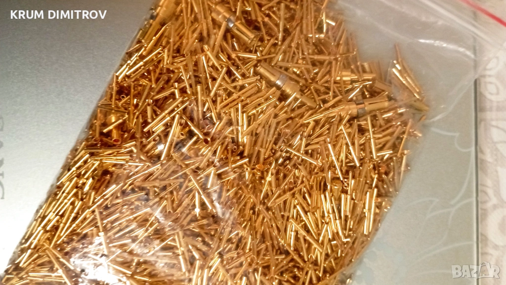 Позлатени пинове от конектори за телекомуникационно оборудване 600грама цената е за цялото количество. При желание изпращам мостри за проба.