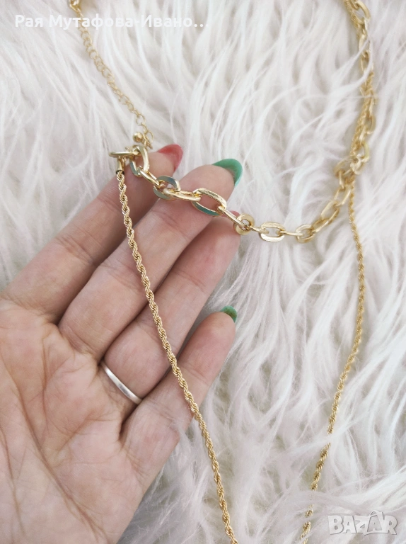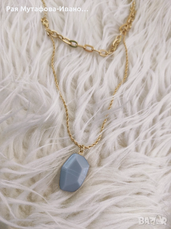 Стилно и модерно колие със златисто покритие и нежно сив камък в естествена, неправилна форма. Комбинацията от две различни вериги придава луксозен и актуален вид – идеално за всеки повод.