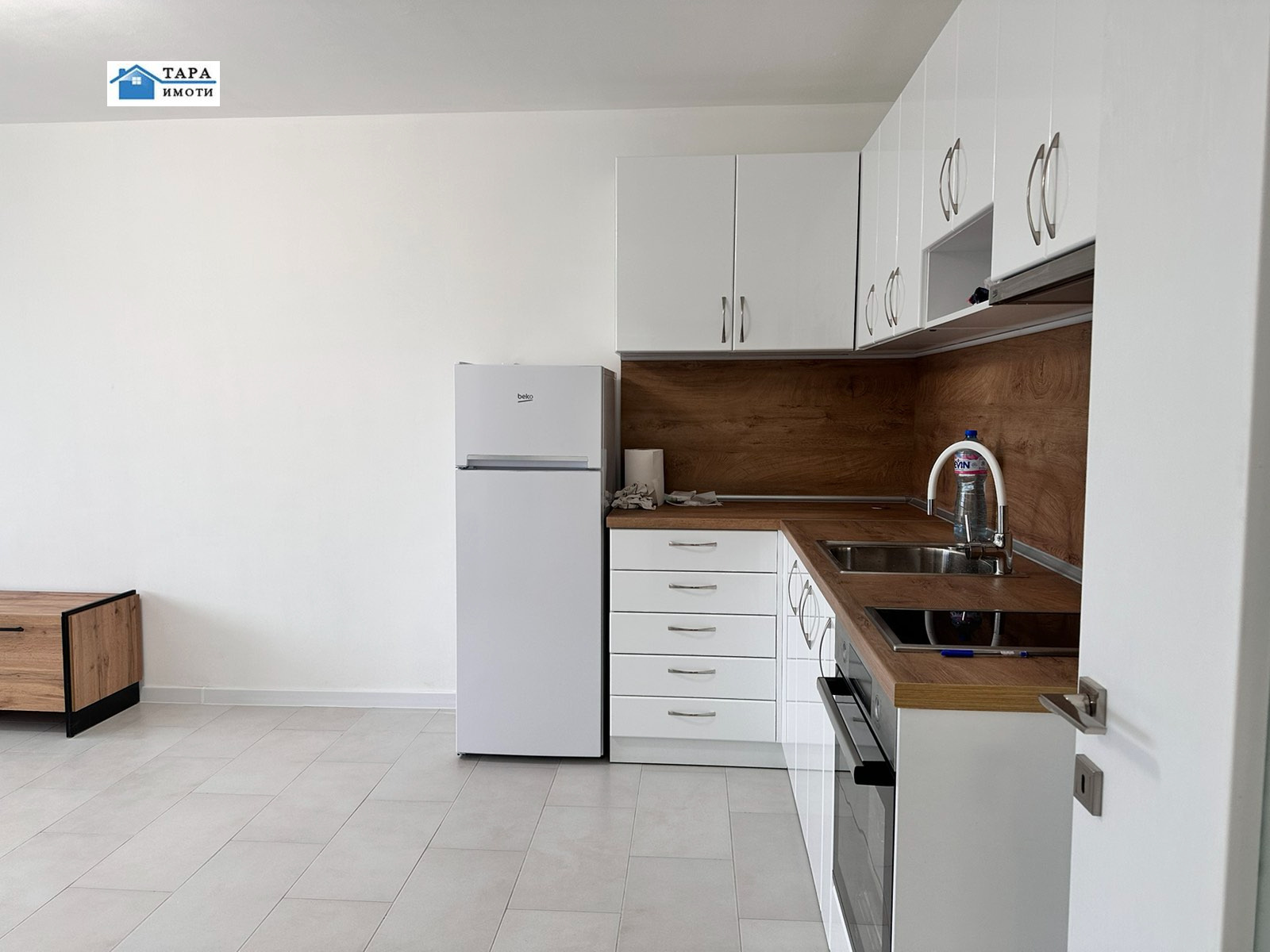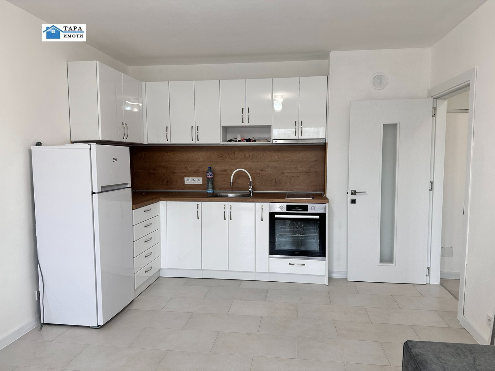 Чисто нова кухня: Модерни шкафове и пълен набор от нови електроуреди (вградена фурна, керамични котлони, хладилник и пералня).