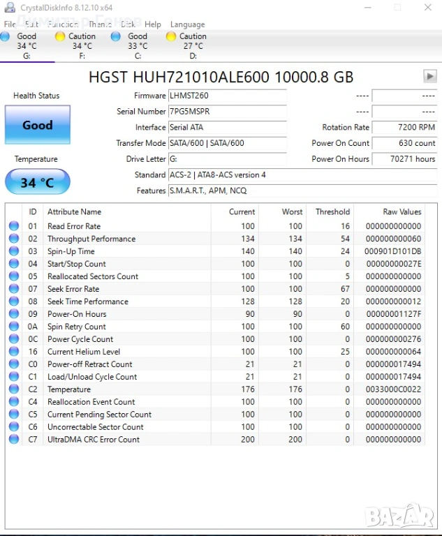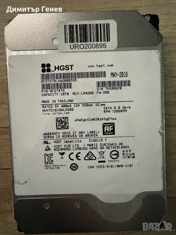 10TB Hitachi SATA 3.5 в добро състояние, свален е от мрежови сторидж. Без грешки, без лоши сектори, без механични проблеми
