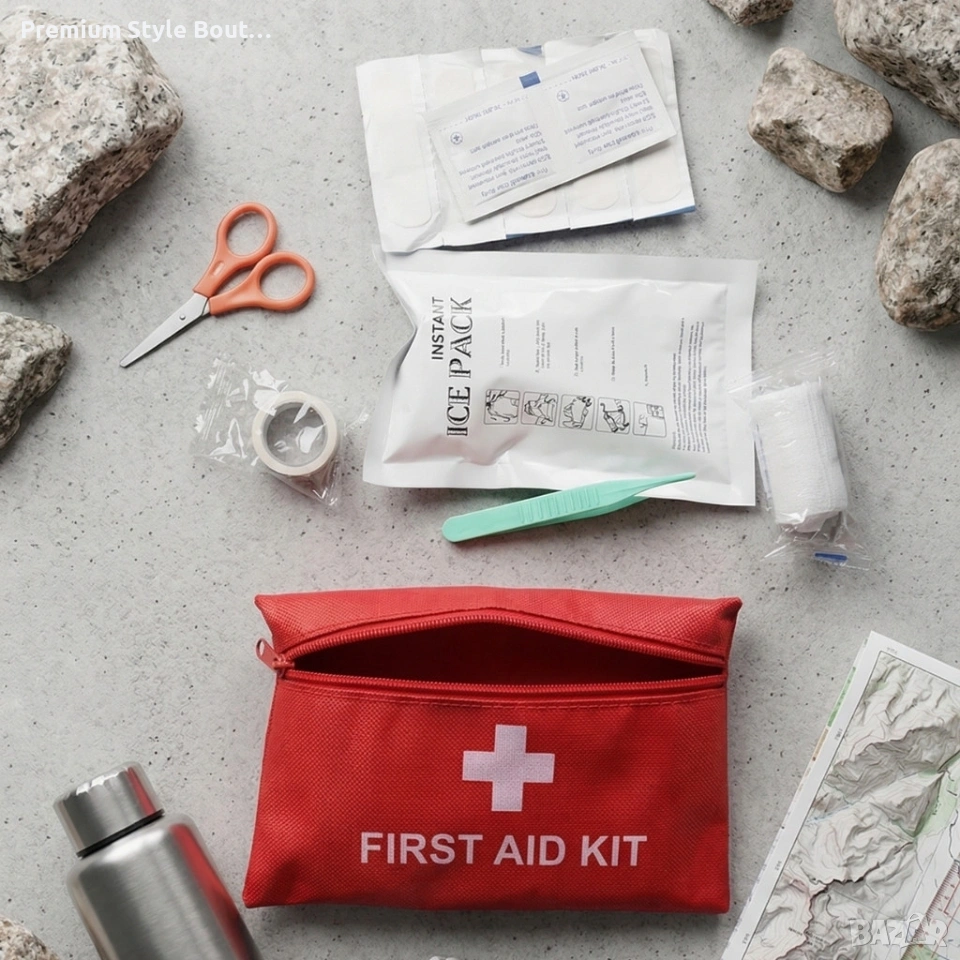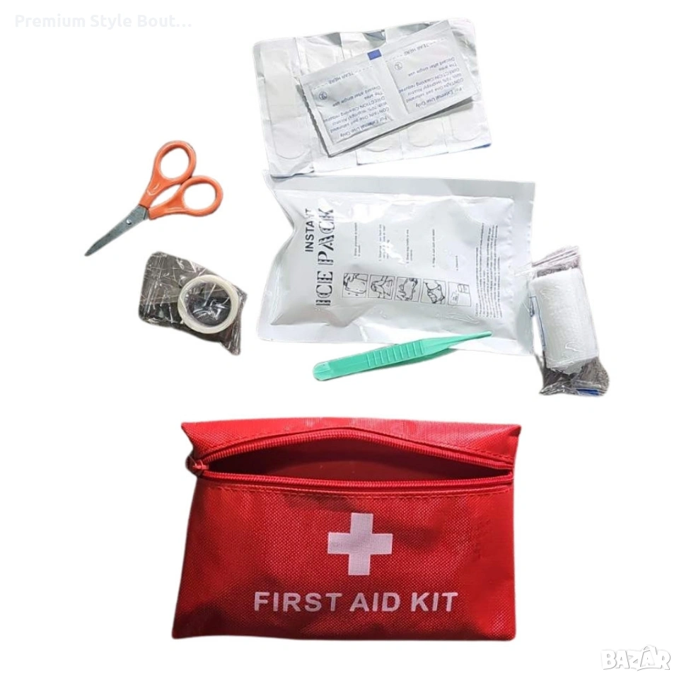 Размери (приблизителни): компактни за лесно съхранение и пренасяне. Материал на чантичката: издръжлив текстил, устойчив на влага и замърсяване. Затваряне: здрав цип за бърз достъп. Основни инструменти: ножица, пинсета, лепенка, стерилни кърпички, компреси, бинт. Подходящ за автомобили, къмпинг, офиси и дома.