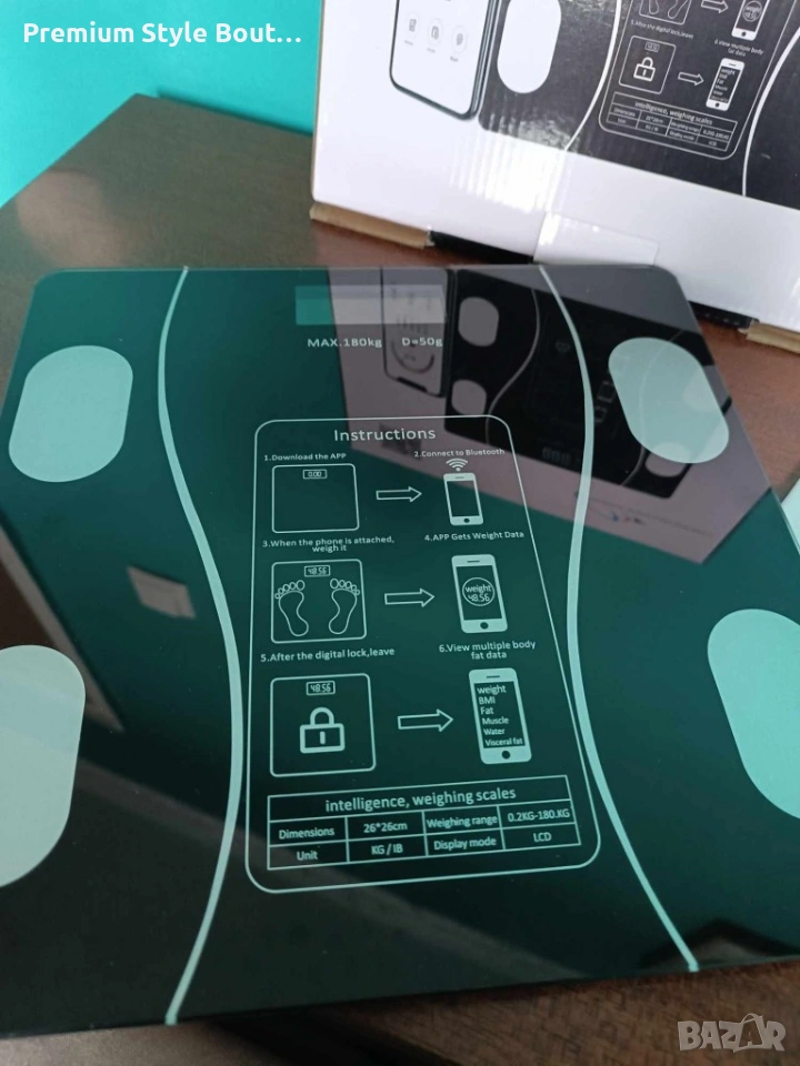 Точност на измерване: Диапазон на измерване от 0,2 до 180 кг; Материали и изработка: Закалено стъкло с дебелина 0,5 мм; Компактни размери: 26 x 26 x 2,3 см; Черен цвят с високоякостна конструкция; Дисплей: LCD дисплей с висока разделителна способност; Ясни показания както през деня, така и през нощта; Батерия: 2бр (не са включени в коплекта); Свързаност: Bluetooth връзка с мобилни устройства; Съвместимост с приложения: OKOK-International - сканирайте QR кода и приложението ще се отвори автоматично.