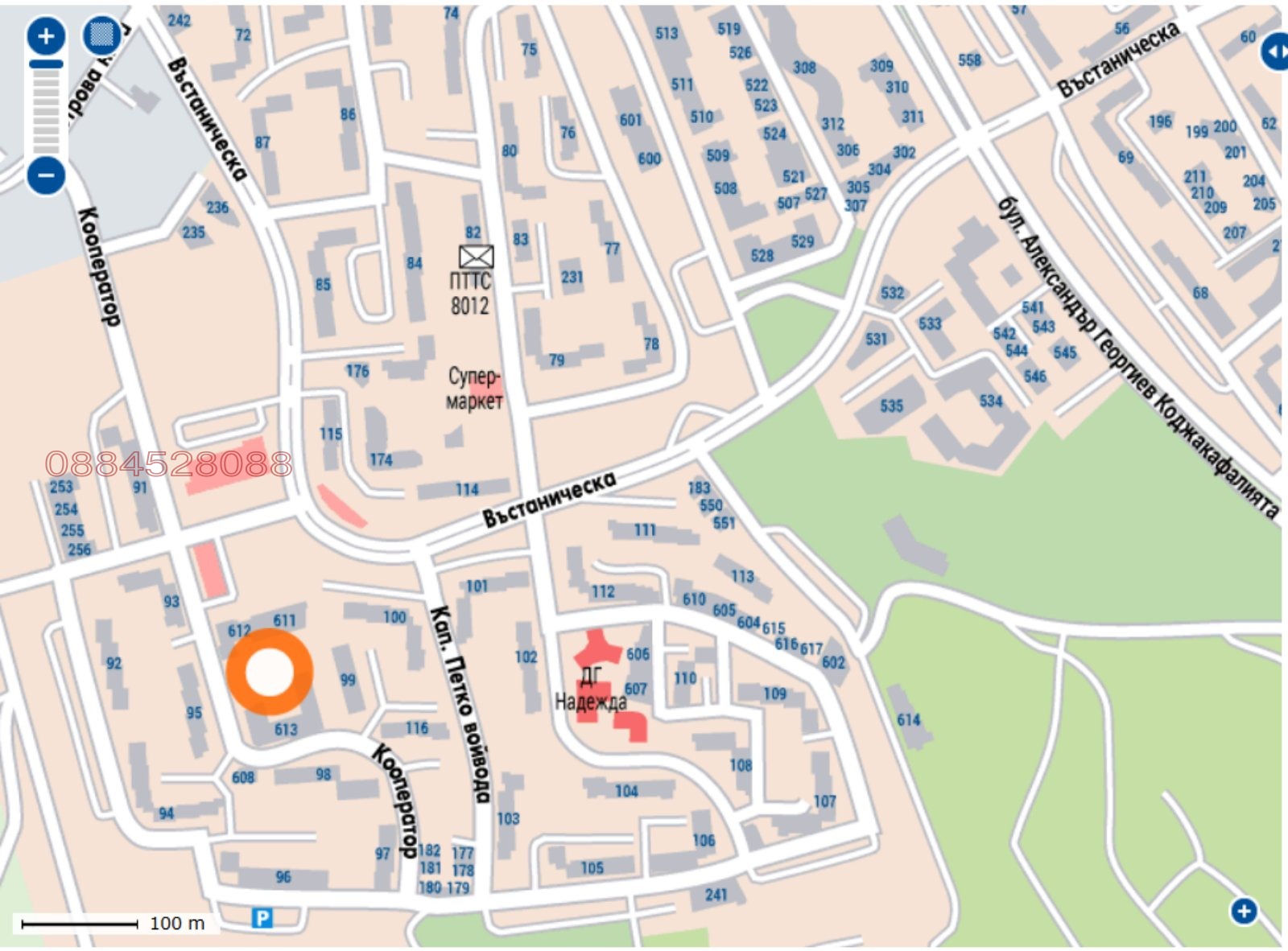 - Гараж расположен в оживленном и коммуникативном месте рядом с: квартал 98, 99, 95, 608, 611, автобусные и троллейбусные остановки общественного транспорта, Burgaski pazari Ltd., мебельный магазин JYSK