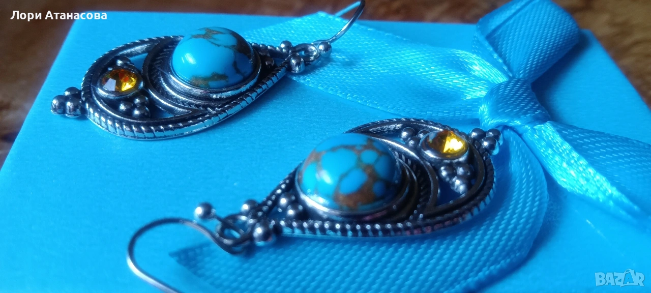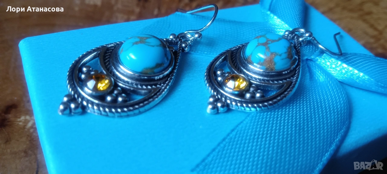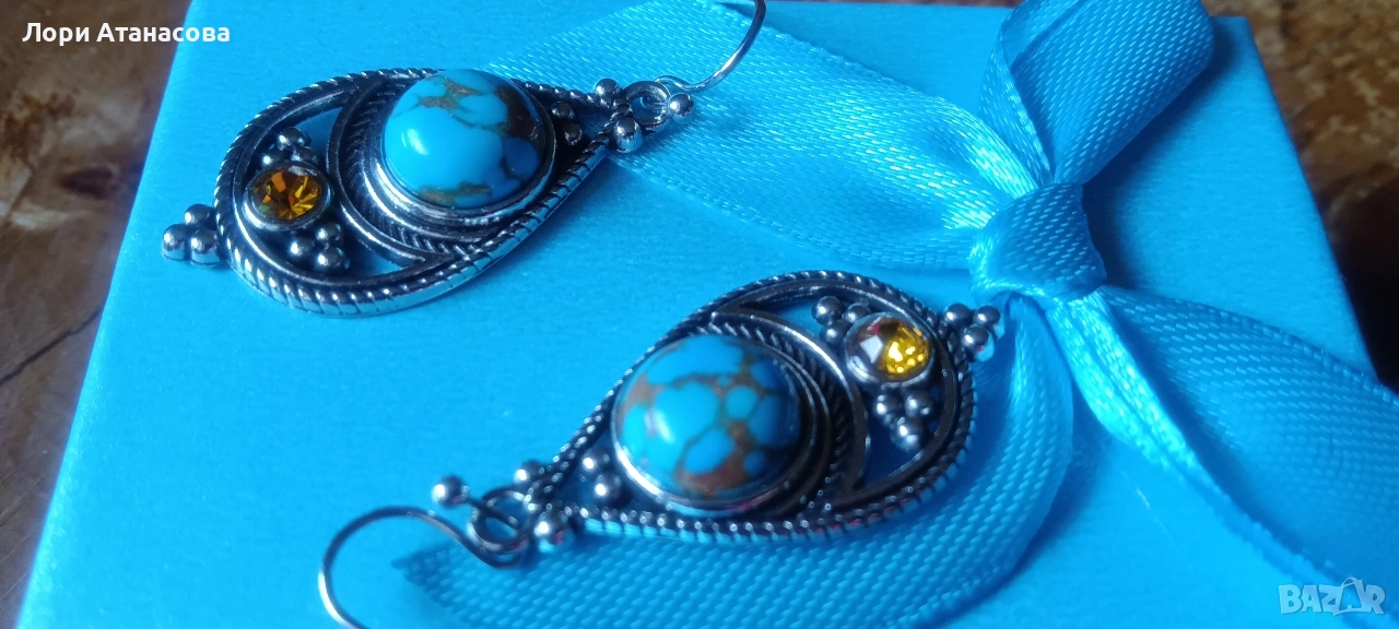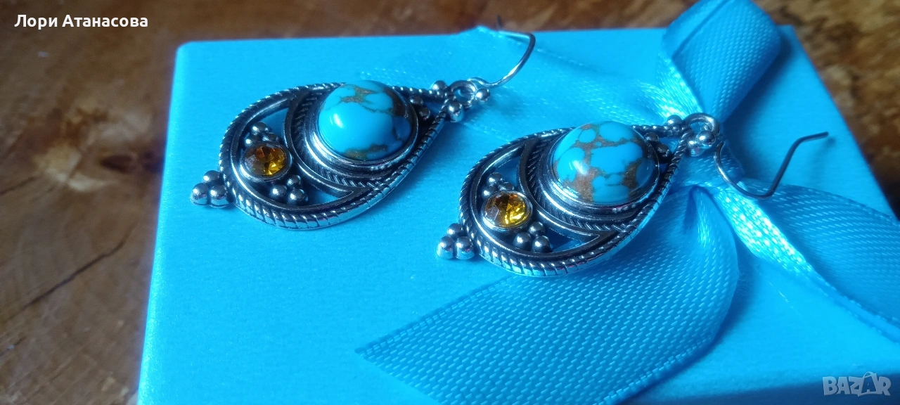 Бохемски обеци с висулка в ретро стил -синтетични тюркоазови инкрустации,никел → Обява 54003654
