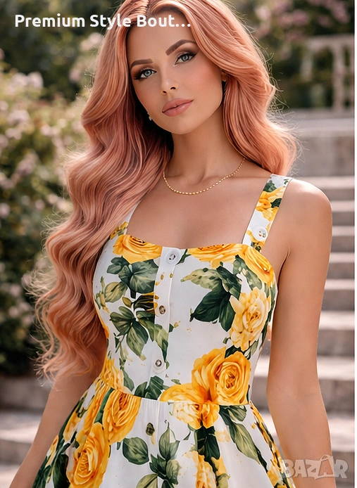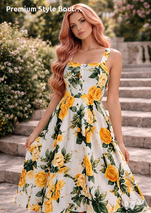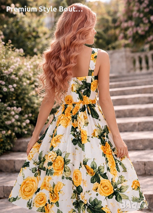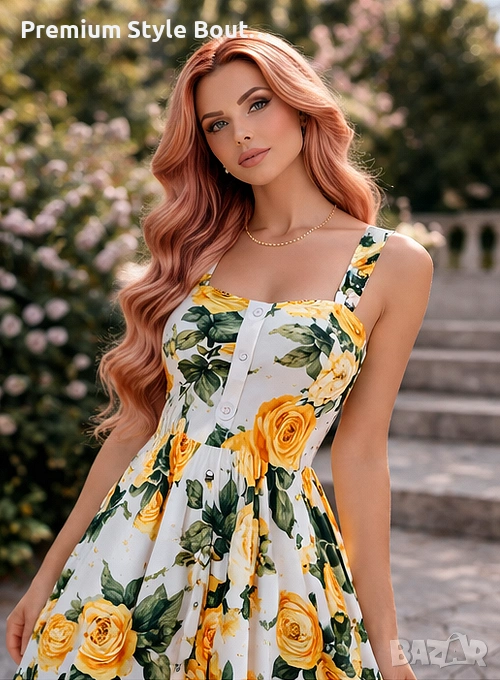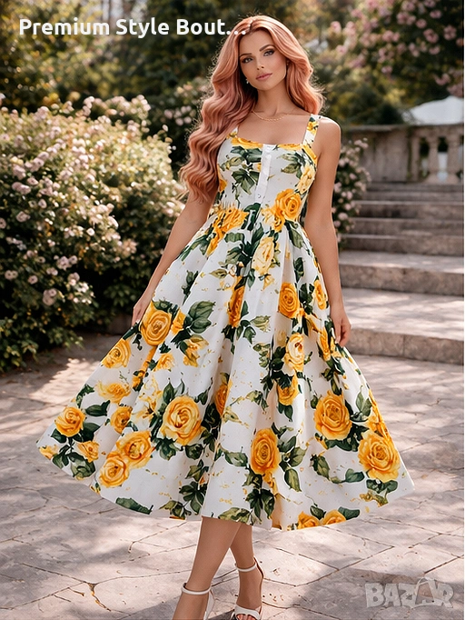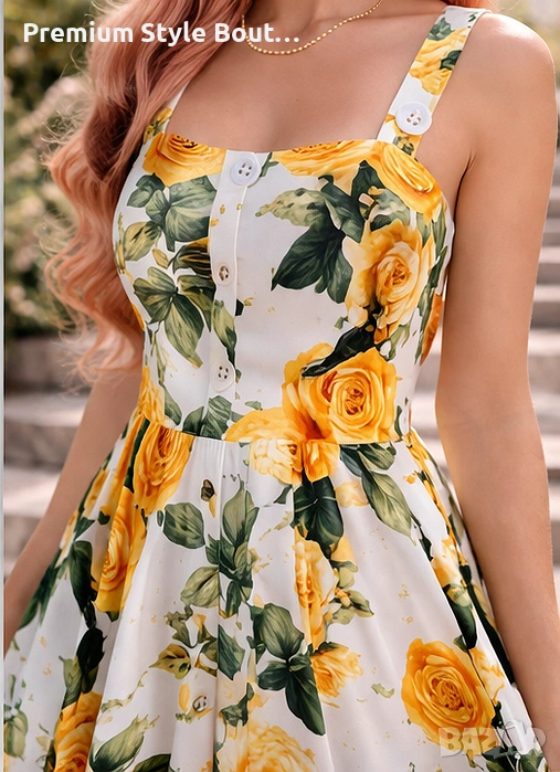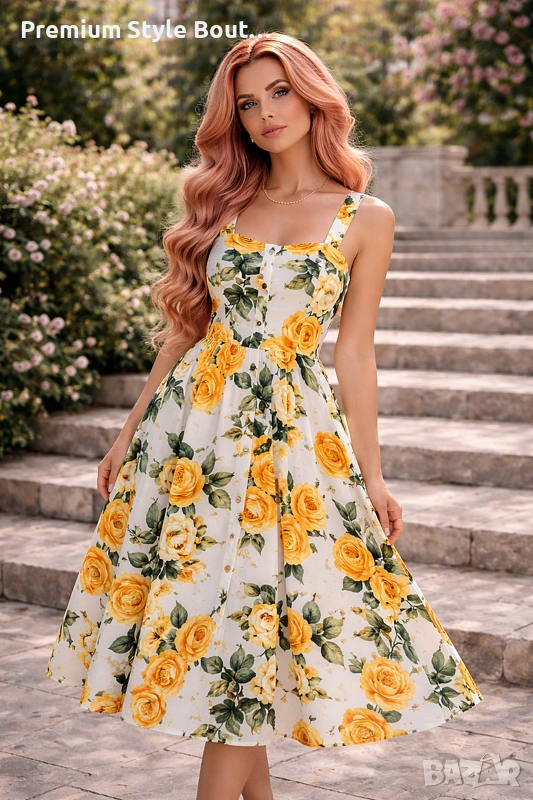 Елегантна дамска миди рокля с впечатляващ флорален принт на жълти рози, създадена за женствена и стилна визия. Моделът е вдъхновен от ретро френския стил и се отличава с квадратно деколте, широки презрамки и красиво подчертана талия. Разкроената пола придава лекота и комфорт при движение, а миди дължината прави роклята подходяща както за ежедневието, така и за по-специални поводи. Изработена е от смес от полиестер и памук, с флорален десен, без ръкави и с миди дължина. Тази рокля е чудесен избор за пролетно-летния сезон, за разходки, почивка, градински партита, романтични срещи и събития на открито. Свежият принт и класическата линия я правят лесна за съчетаване както с елегантни обувки, така и с по-ежедневни аксесоари. Миди дължината, квадратното деколте и флоралният мотив са сред основните характеристики на модела. Характеристики: Тип продукт: дамска рокля Стил: елегантен, ретро, casual Дължина: миди Деколте: квадратно Ръкави: без ръкави Десен: флорален / жълти рози Материя: полиестер и памук Силует: вталена горна част с разкроена пола Подходяща за: пролет, лято, ежедневие, почивка, събития, парти