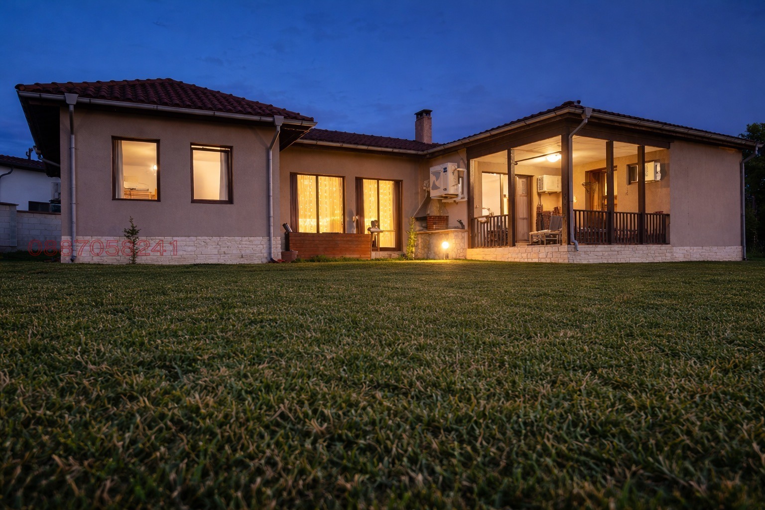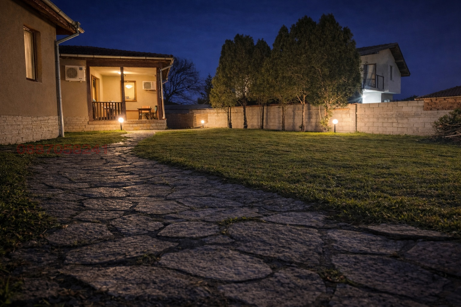 настилки от естествен камък (пътеки и зона барбекю), архитектурно и външно осветление, зона за барбекю, отделно изградени дърварник и стопанска постройка. Осигурено паркомясто.