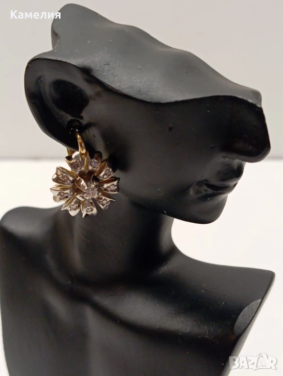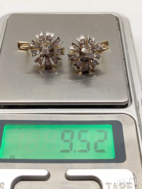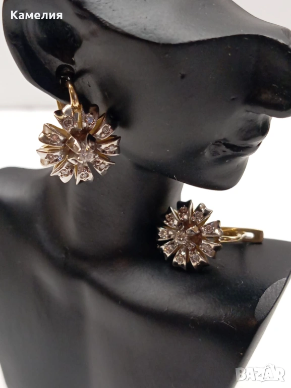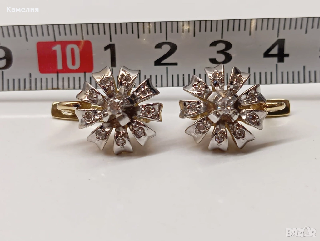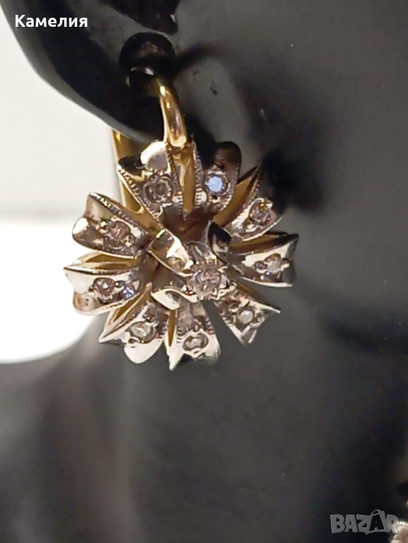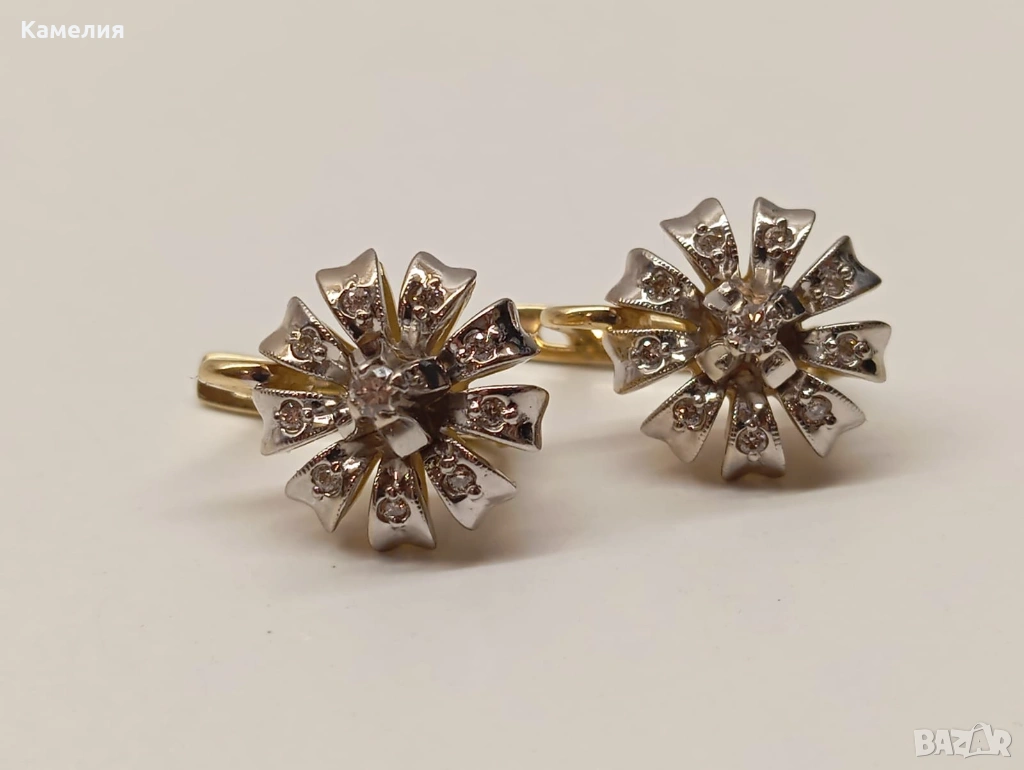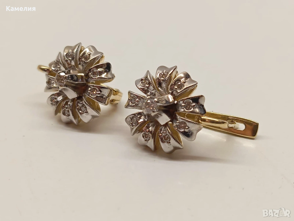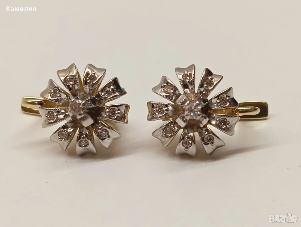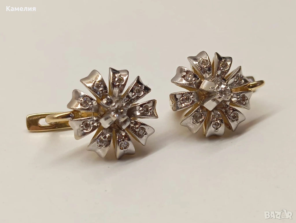 Красиви руски златни масивни обеци с брилианти. Проба 585 глава с кокошник. Москва. Грамаж 9,52 грам. Бр-0,33сt. Диаметър на короната 15 мм.