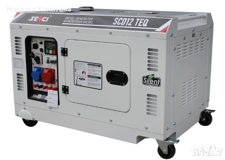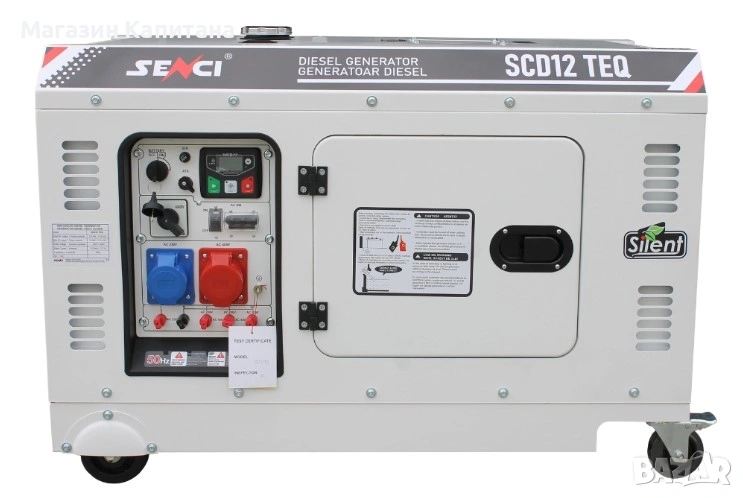 Шумоизолиран дизелов трифазен генератор Senci SCD12 TEQ предлага комбиниран изход на 230 V и 400 V, което го прави подходящ за широк диапазон електрически консуматори. Осигурява номинална мощност 9.5 kW (11.9 kVA) и максимална мощност 10 kW (12.5 kVA). При работа на 230 V максималният ток достига 33.04 A, а при 400 V - 13.71 A. Моделът е оборудван с четиритактов дизелов двигател SC1105FD с въздушно охлаждане, работен обем 761 см³ и нисък разход на гориво под 230 грама на kW/h. Агрегатът имa наличен 12 V DC изход, с капацитет 8.3 A, подходящ за зареждане на акумулатори. Резервоарът за гориво е с вместимост 30 литра, което осигурява приблизително 8,8 часа непрекъсната работа при натоварване. Управлението става чрез централен контролен панел, който включва волтметър, индикатор за честота, брояч на работните часове и основни предпазни функции. Корпусът е звукоизолиран, което го прави подходящ за употреба в близост до жилищни и търговски сгради. Има опция за свързване с ATS.