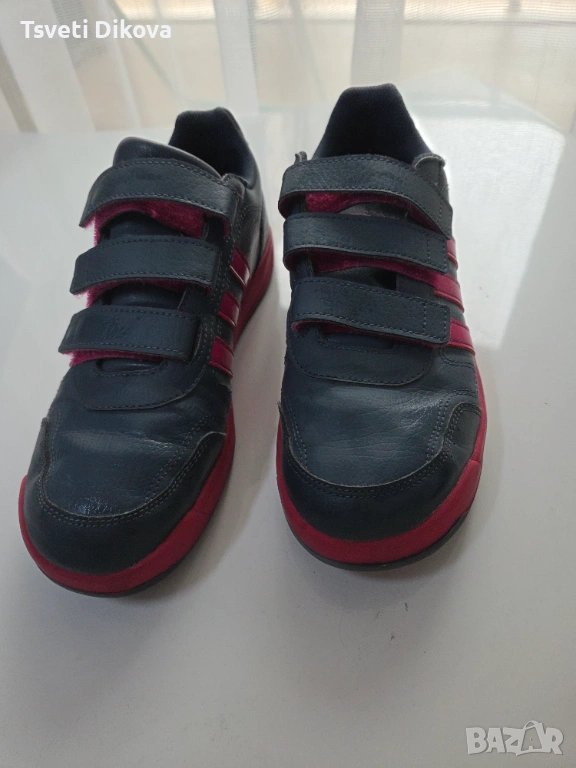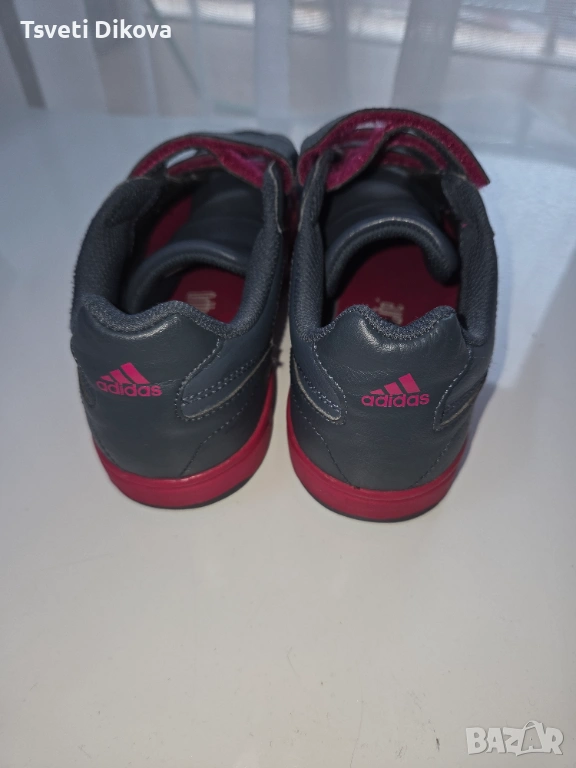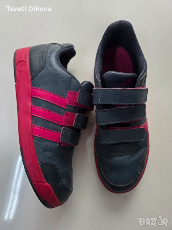 Детски/дамски маратонки естествена кожа на Adidas. Комбинациа от сиво с цвят фукс, три велкро лепенки. С минимални следи от употреба.