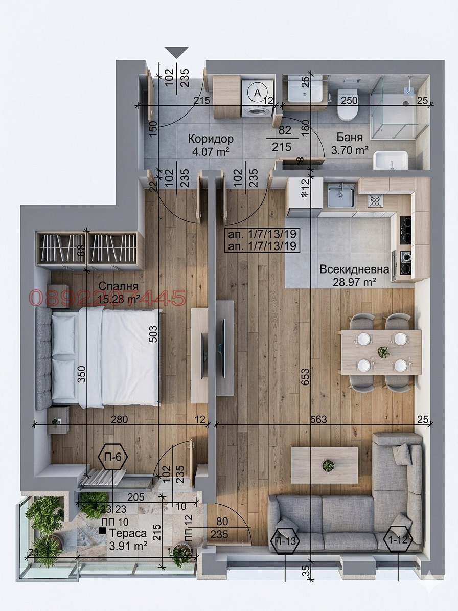 Разпределение: Просторна дневна с кухненски бокс (23.50 м²), слънчева спалня (12.61 м²), входно антре, баня с тоалетна и тераса с достъп от дневната и спалнята.