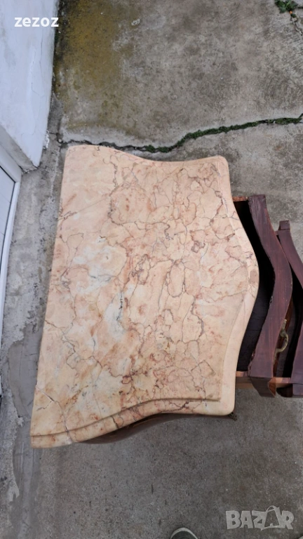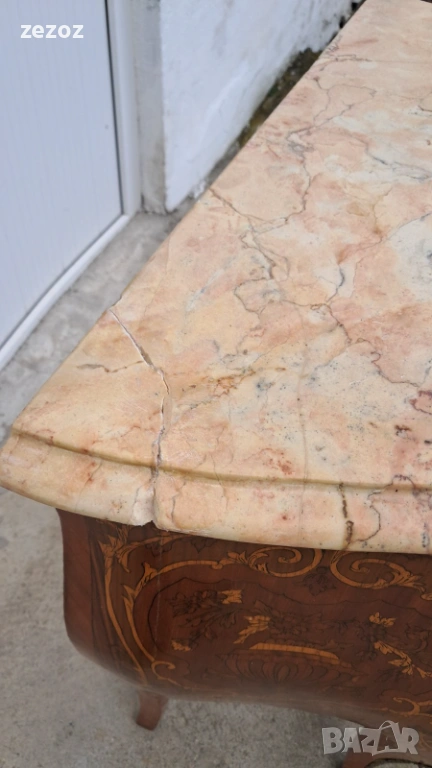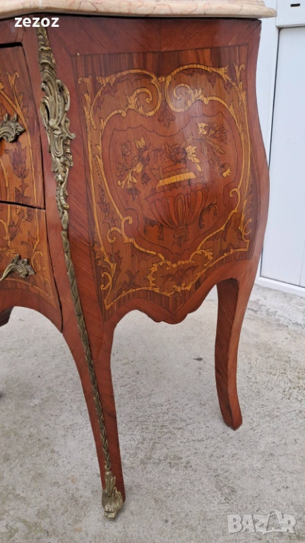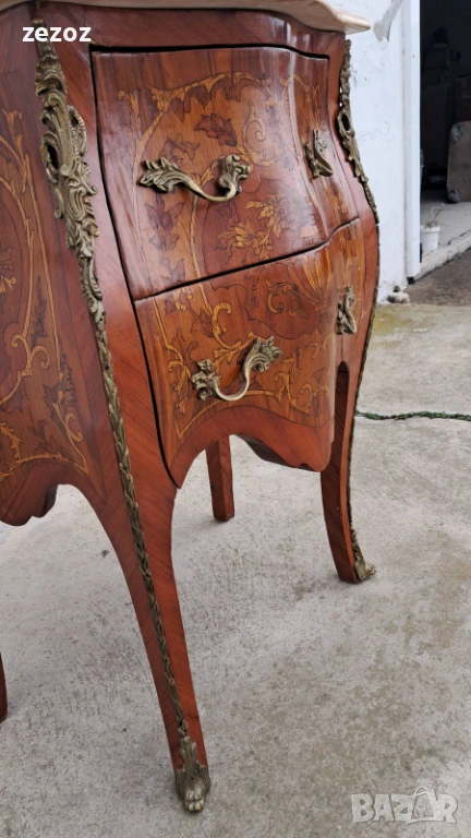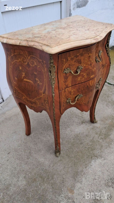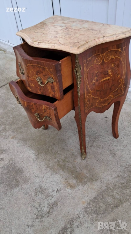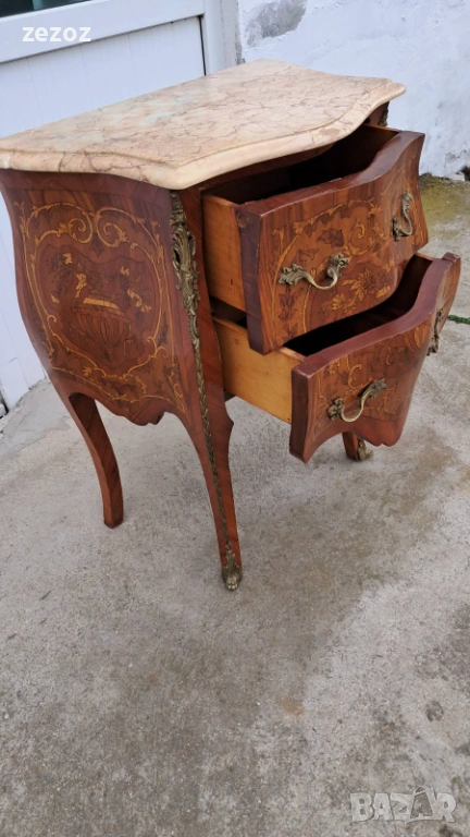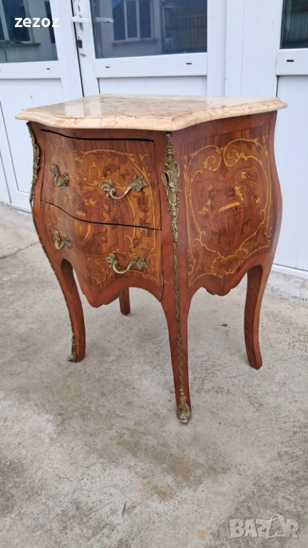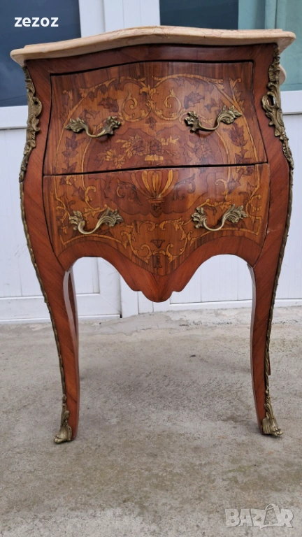 Малък скрин с две чекмеджета,изработен от масив в стил Луи 15.Характерните за стила тумбести форми "Bombe".Масив облечен с фурнир с богата интарзия и месингов обков.Увенчан с мраморен плот в светло бежовата гама с характерни жилки.Конструктивно здрав и запазен.Мрамора има забележка-бил е счупен и залепен,но не от нас,видимо на снимките.Размери-