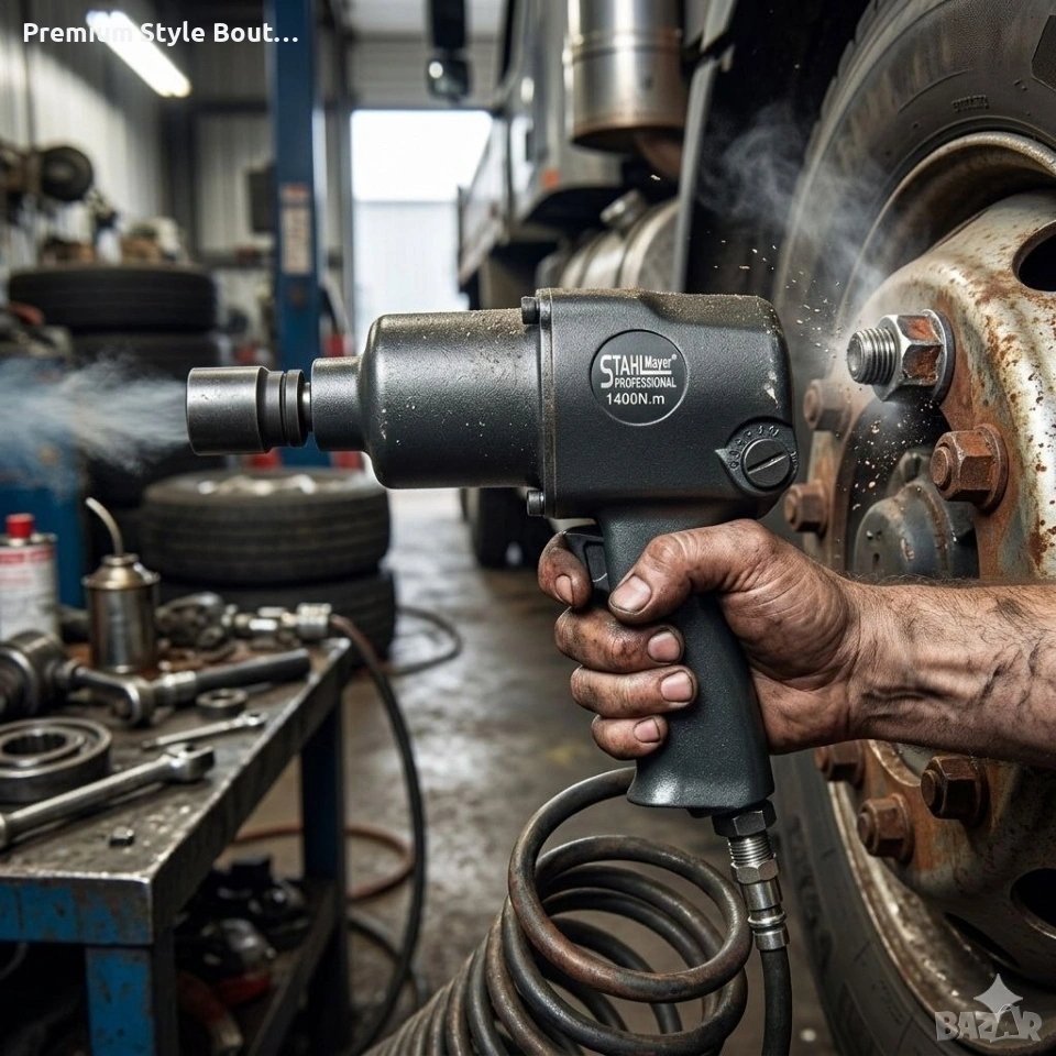 Мощен и надежден пневматичен ударен гайковерт, създаден за интензивна работа в автосервизи, вулканизатори и професионални работилници. Благодарение на двойния ударен механизъм инструментът осигурява висок въртящ момент до 1400 Nm, позволяващ бързо развиване дори на силно затегнати болтове. Компактният и масивен корпус гарантира издръжливост при ежедневна употреба, а ниските вибрации осигуряват по-комфортна работа. Характеристики: • Висока мощност и ефективност • Двоен ударен механизъм • Превключване ляв/десен ход (R/L) • Подходящ за професионална употреба • Идеален за смяна на гуми и сервизни дейности Технически характеристики: • Захват: 1/2" • Максимален въртящ момент: 1400 Nm • Обороти на празен ход: 8500 об./мин • Работно налягане: 6.3 bar • Разход на въздух: 127 л/мин • Въздушна връзка: 1/4" (6.3 mm) • Ниво на шум: LpA 94.4 dB(A) • Включен бърз конектор: 7.2 mm Комплектът включва: • Пневматичен ударен гайковерт – 1400 Nm • 10 броя ударни вложки и удължители • Размери: 9, 10, 11, 13, 14, 17, 19, 22, 24, 27 mm Перфектен избор за: • Автосервизи • Гумаджийници • Монтаж и демонтаж на джанти • Професионална и домашна употреба