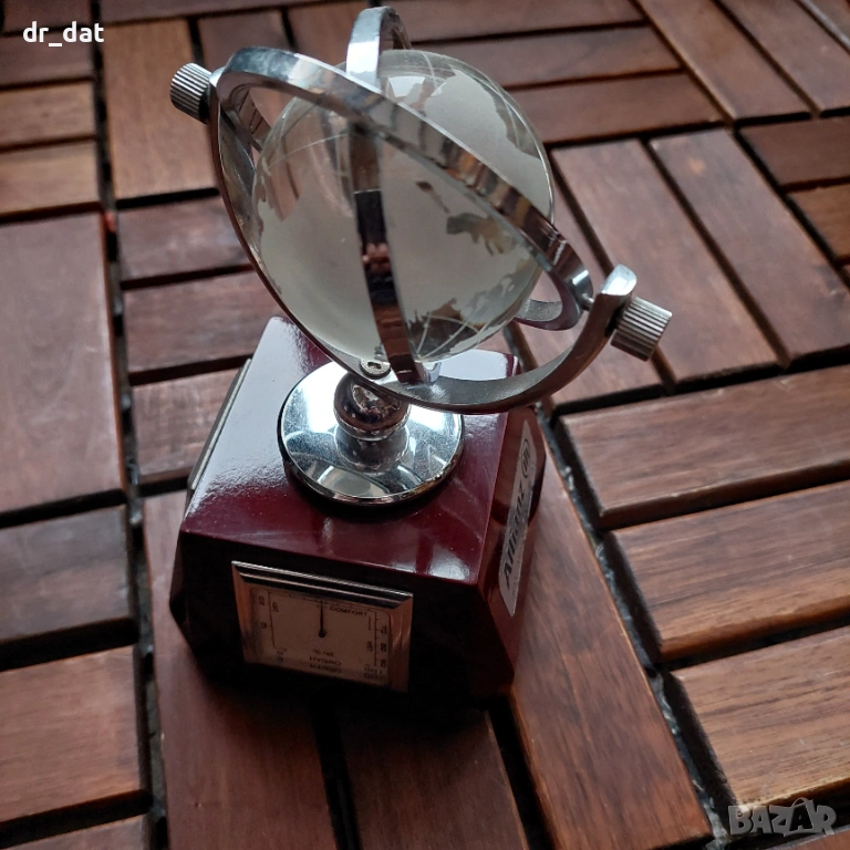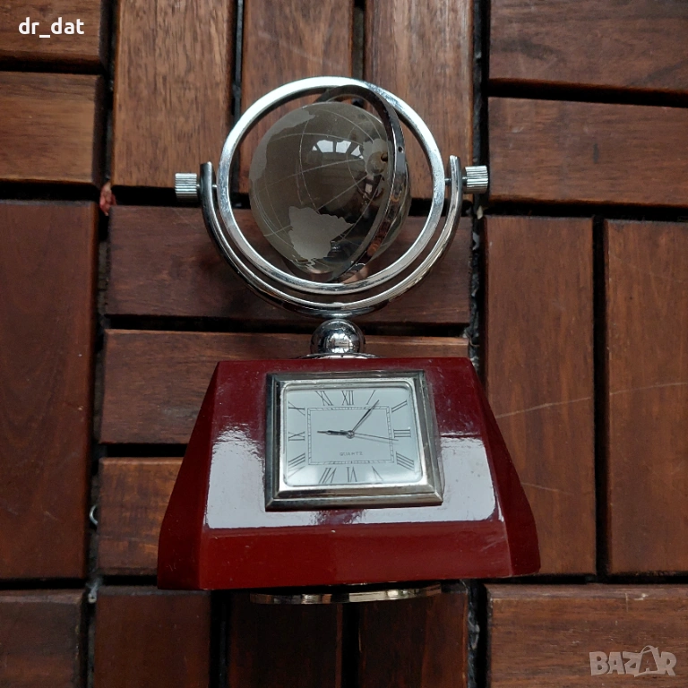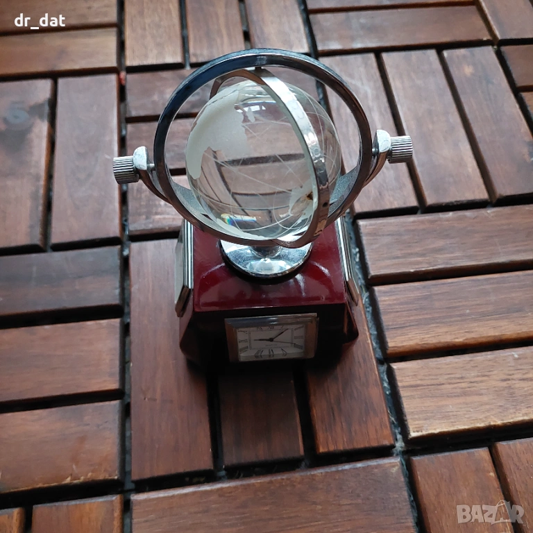 Стар, но запазен рекламен настолен часовник - има лого на Алианц. Представлява стабилна основа с три уреда (батерията на часовника трябва да се смени). Върху основата е поставен стъклен глобус, който се върти по няколко оси. На едното от местата на захващане има леко отлюспване на стъклото - 1-2мм, което не пречи на движението и не се вижда. Вероятно е някъде от началото на века, ако се съди по рекламното лого.