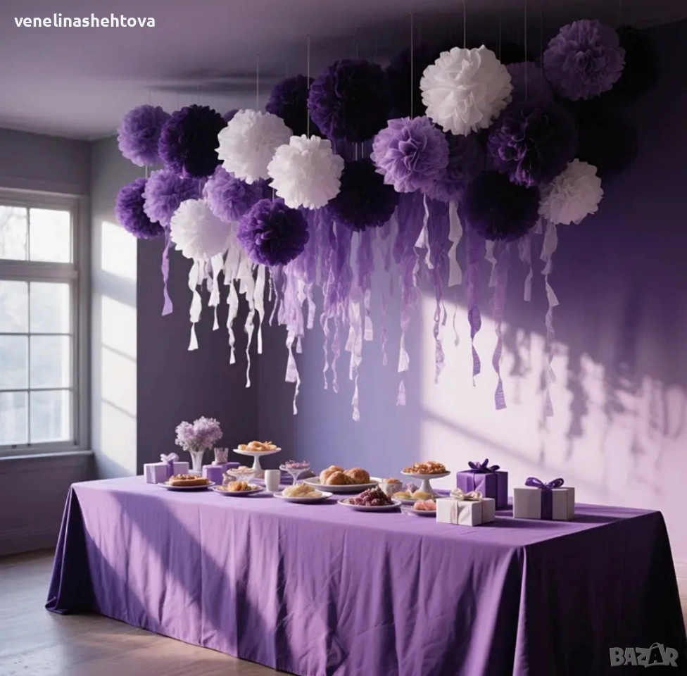 17 броя големи помпони различни размери лилави бели парти декорация → Обява 54007052