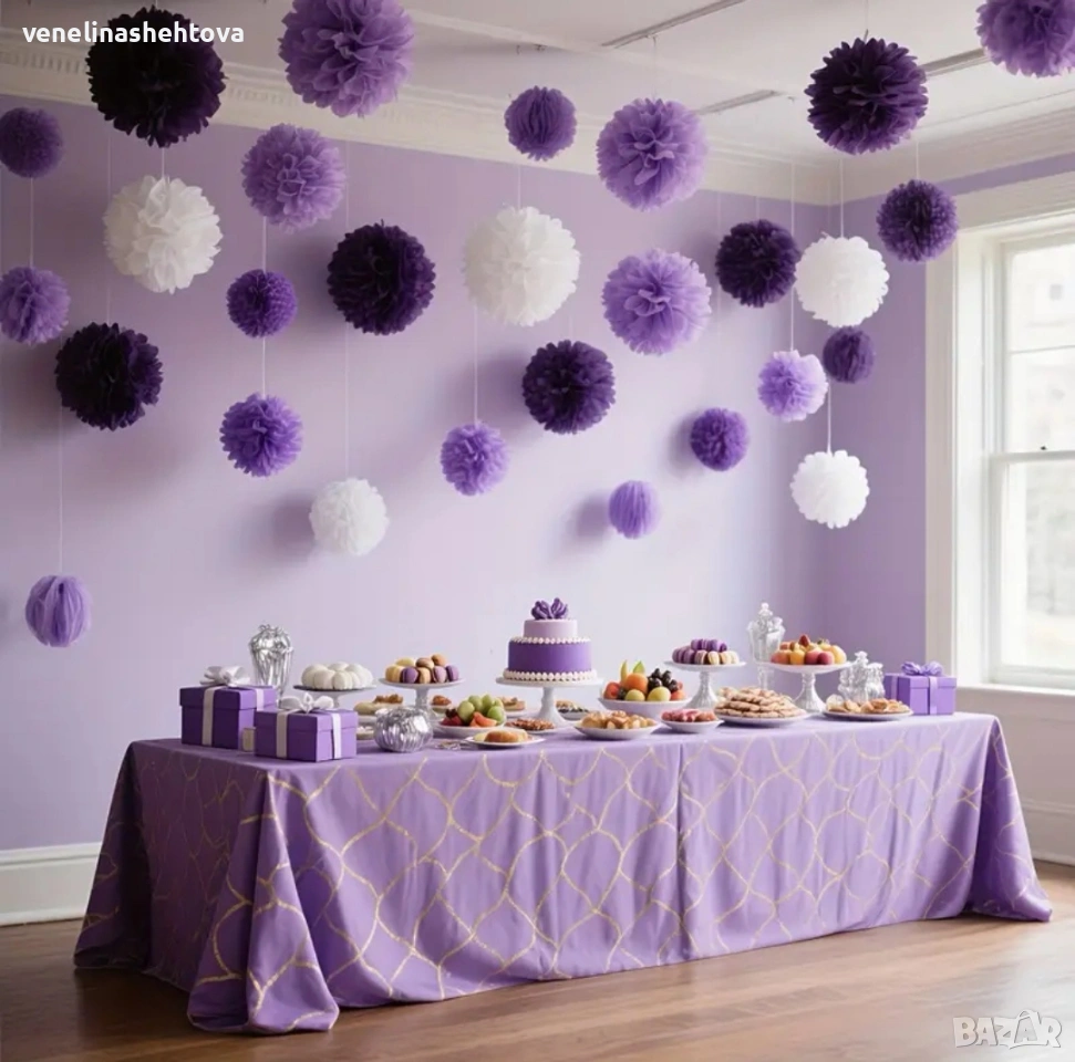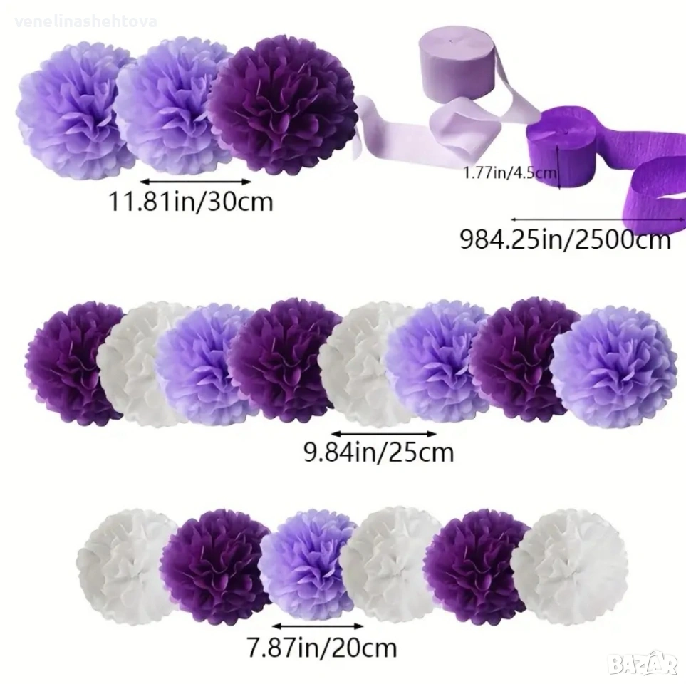 Комплект от 17 броя помпони за декорация на парти в лилав и бял цвят и две ленти