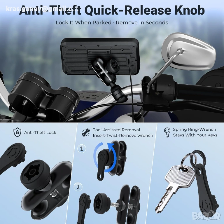 【Подсилена стойка за кормило против кражба - лесен монтаж и максимална стабилност】В комплекта са включени здрава стойка за кормило, винтове и инструменти за бърз монтаж. Здравата конструкция гарантира, че дисплеят на мотоциклета ще остане здраво закрепен дори при висока скорост или по неравни пътища. Интегрираната система против кражба с ключ осигурява допълнителна защита.