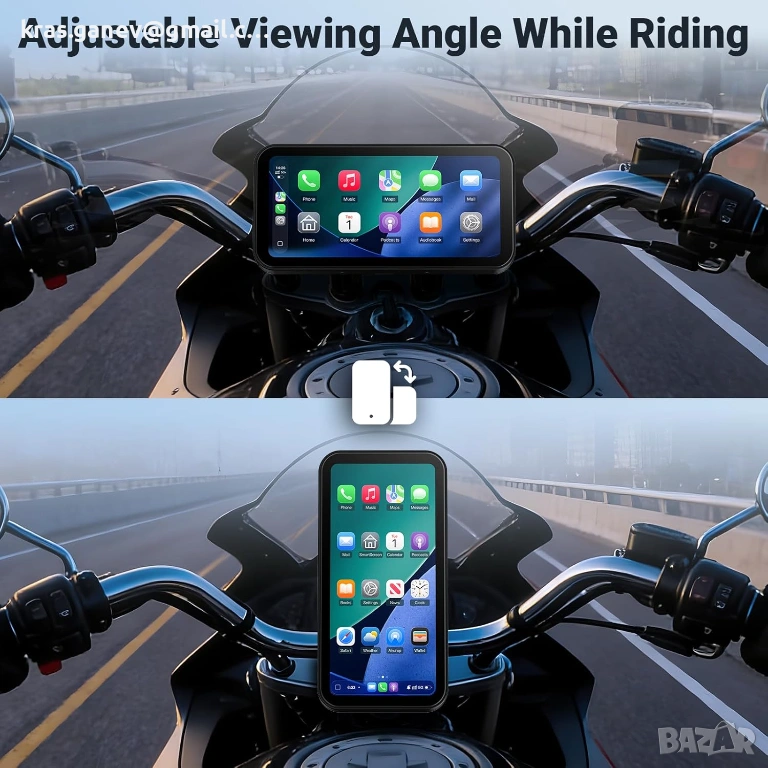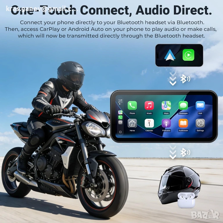 Двоен Bluetooth за мотоциклетна каска или интерком - Музика, разговори и навигация без ръце: Мотоциклетният дисплей APHQUA CarPlay поддържа едновременна Bluetooth връзка със смартфона и мотоциклетната каска или интерком. Слушайте музика, получавайте навигационни указания и отговаряйте на повиквания, без да сваляте ръцете си от кормилото. За напълно безжично и безопасно шофиране.