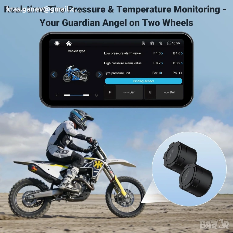 Вграден TPMS с 2 сензора - Следене на налягането в гумите в реално време за по-голяма безопасност при шофиране: Този дисплей за мотоциклет има вграден TPMS със сензори за предни и задни колела, който следи налягането и температурата в гумите в реално време. Ако налягането е твърде ниско, на дисплея незабавно се появяват предупреждения. Това повишава безопасността при шофиране, намалява износването на гумите и помага за избягване на инциденти. Идеален за дълги пътувания и ежедневна употреба.