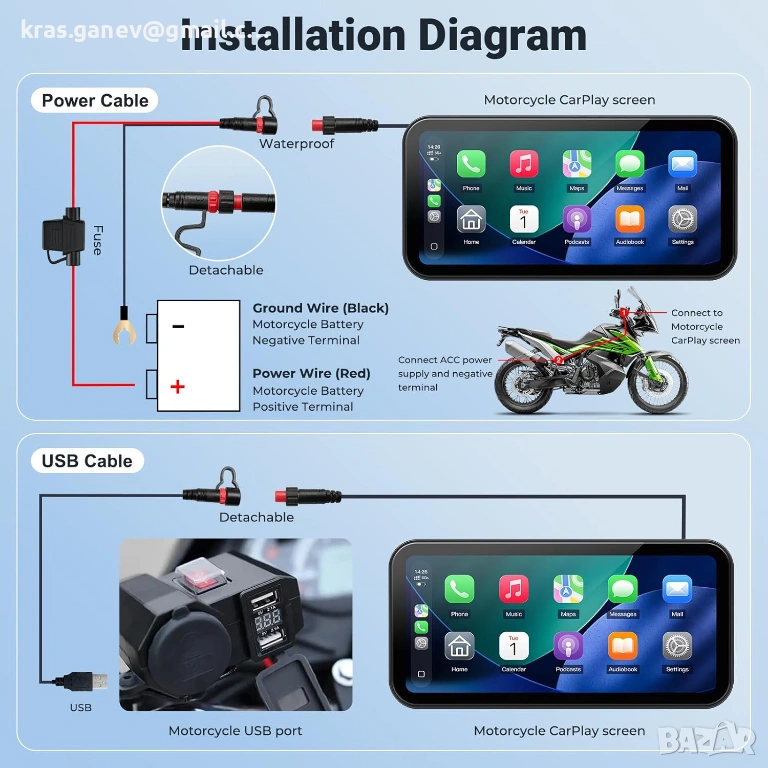 【USB или ACC захранване - Автоматично включване с мотоциклет】Този мотоциклетен CarPlay дисплей поддържа ACC 12V захранване за автоматично включване при стартиране на мотоциклета или удобно USB plug and play захранване. За стабилна работа се препоръчва USB захранване с поне 5V/2.5A, за да се избегнат рестартирания или прекъсвания на захранването.