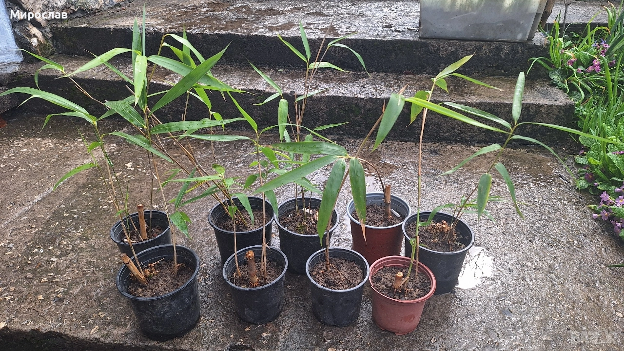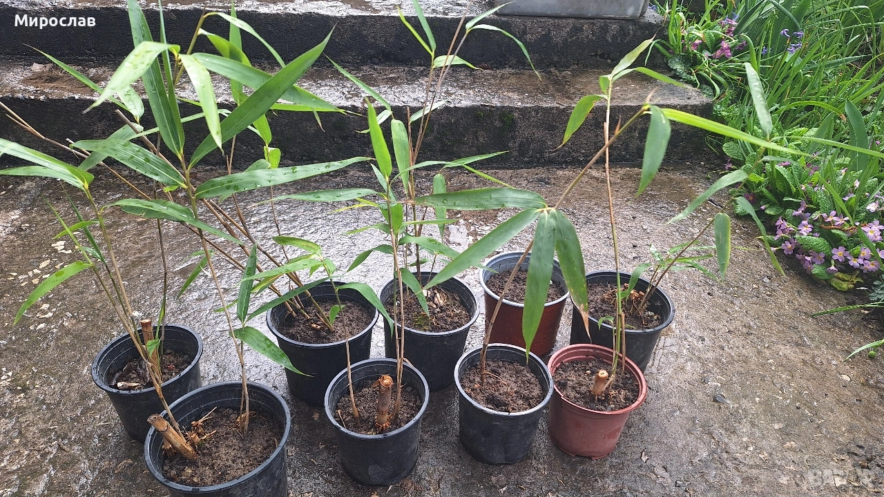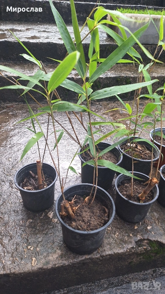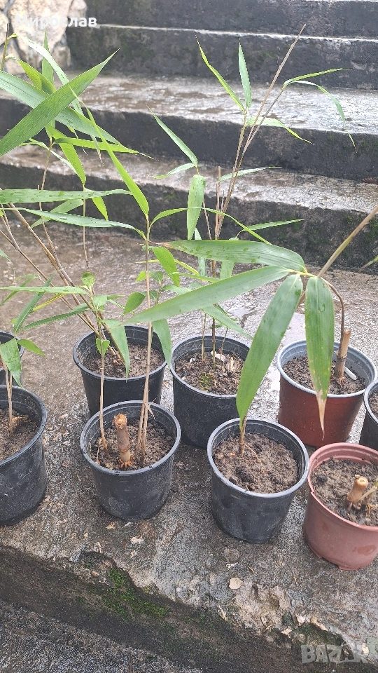 Продавам бамбук, студоустойчив на цена от 3,50 евро. за брой или 2бр. за 6 евро. Растенията са добре вкоренени, двугодишни, високи 40-60см. засети в контейнери. Снимките на растенията са реални като последните 4 са примерни. Доставката се извършва за сметка на купувача или лично предаване. Доставям с „Еконт“ или „Спиди“ с опция преглед. Благодаря. Описание на студоустойчив бамбук Сортът е Bambusa graminea (Pleioblastus gramineus). Видът произхожда от Япония, където се култивират широко с декоративни цели. При оптимални условия достига до 4 м. височина и до 2 см. дебелина на стъблата. За Северна България вероятно максималната височина ще е около 2-3 м., за южна - 3-4 м. Сред високо растящите студоустойчиви бамбуци това са едни от най-декоративните видове. Стъблата им растат вертикално, без значим наклон - не случайно видовото му латинско име "fastuosa" означава "горд", "надменен". Разклоненията на стъблата, по които са листата са сравнително къси, което придава на листата кичест вид. Разпространяват се бързо и дава множество издънки, които са разположени сравнително близко една до друга. Растат добре и на слънце, и на полусянка. Тези бамбуци, които отглеждам са подходящи за жива ограда/плет , но само ако ви устройва височина до 3-3,5 метра. Тези видове не саподходящи за райони, в които температурата често пада под -27 градуса. Отглеждам го на 400 м. надморска височина в Централна Северна България и неизмръзва. Бамбукът расте върху влажна почва и ярко слънце през лятото, а през зимата на по-сухи местообитания, защитени от вятър. Зимоустойчиво растение, което обича преовлажняването. Може да се засади в близост до водоем. Не сейте близо до стени и огради, защото има мощна коренова система. Стъблата му са кухи и възлести, а тесните му линейни листа са с дължина около 10 см. Бамбукът е енергия. Засадете си един стрък на изток. Според китайското учение фън-шуй бамбукът, поставен на източната страна в къщата, ще донесе на обитателите й здраве, щастие и ще способства за приток на положителна енергия и поддържането на доброто настроение. Символ е на дълголетието, съвършенството на човека и на синовната доброта.