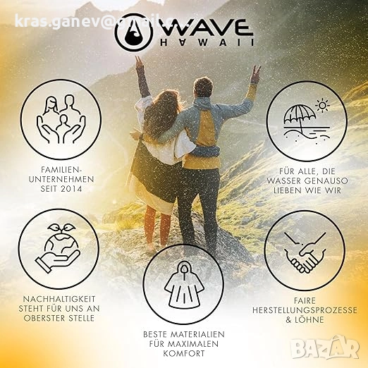 Естествен памук - Пончото WAVE HAWAII е изработено от висококачествен, сертифициран памук. Издръжливият велур отвън осигурява елегантен вид, докато абсорбиращият хавлиен плат отвътре осигурява приятно усещане върху кожата. Двуслойната качулка с висока яка надеждно предпазва от вятър и ви държи приятно топли.