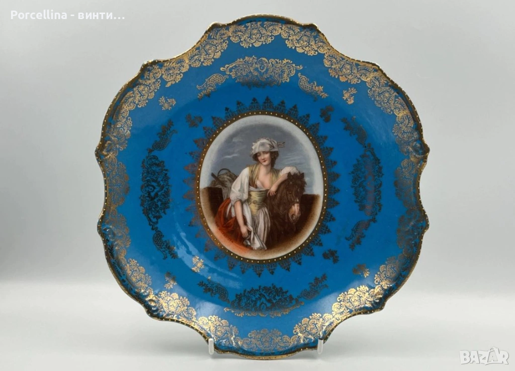 великолепно портретно плато в синьо и злато, образ на красива млада дама с коня си и надпис под образа, диаметър Ф25 см, изящен и рядък модел, отлично качество на изработка, без чипове и счупвания, прекрасна визия, богатство за всяка колекция или витрина.