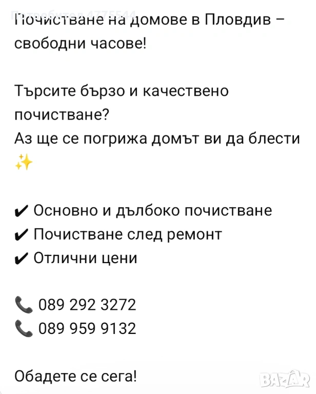 Услугите включват:✔ Еднократно почистване✔ Абонаментно почистване✔ Основно и дълбоко почистване✔ Почистване след наематели✔ Почистване преди нанасяне✔ Почистване по индивидуални изисквания