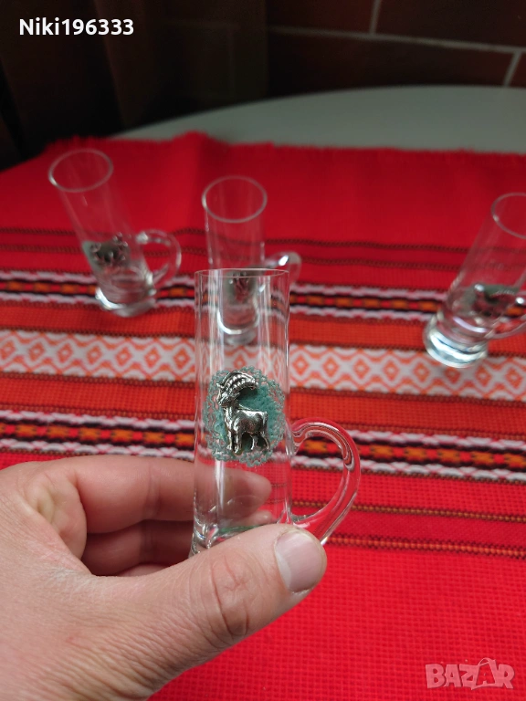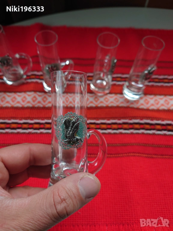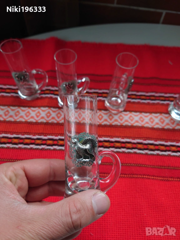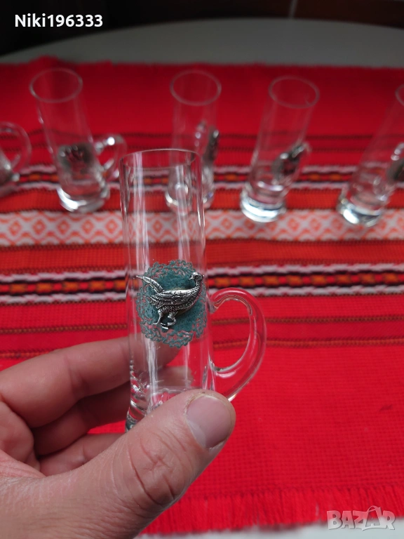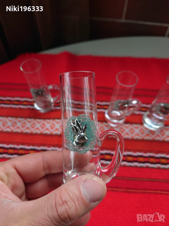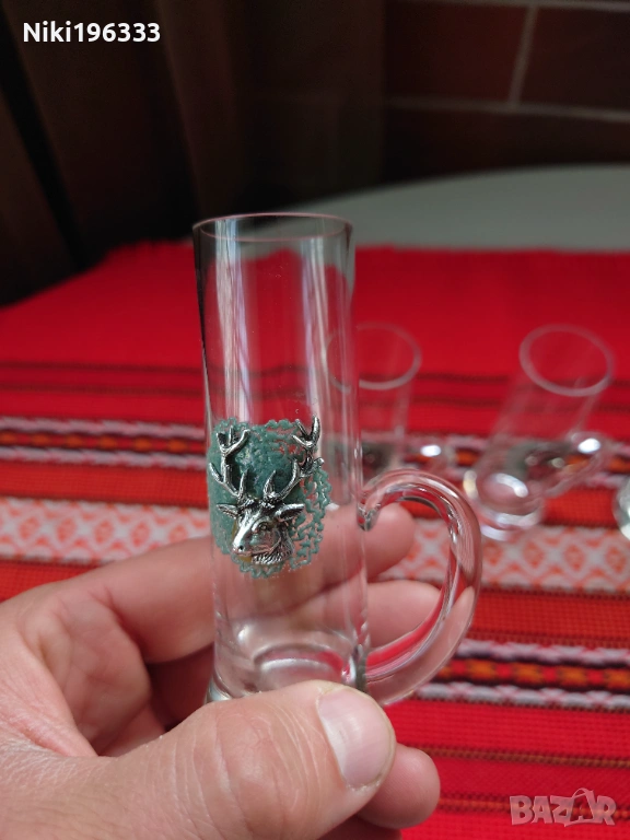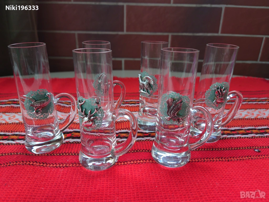 Всяка чаша е малко произведение на изкуството, декорирана с детайлен метален (калайдисан) медальон, изобразяващ различни диви животни (елен, сръб, дива коза, пуйка, орел, фазан). Медальоните са поставени върху красива зелена основа, наподобяваща дантела, което им придава автентичен ловен стил (Jägermeister стил). Чашите са стабилни, с удобни дръжки.