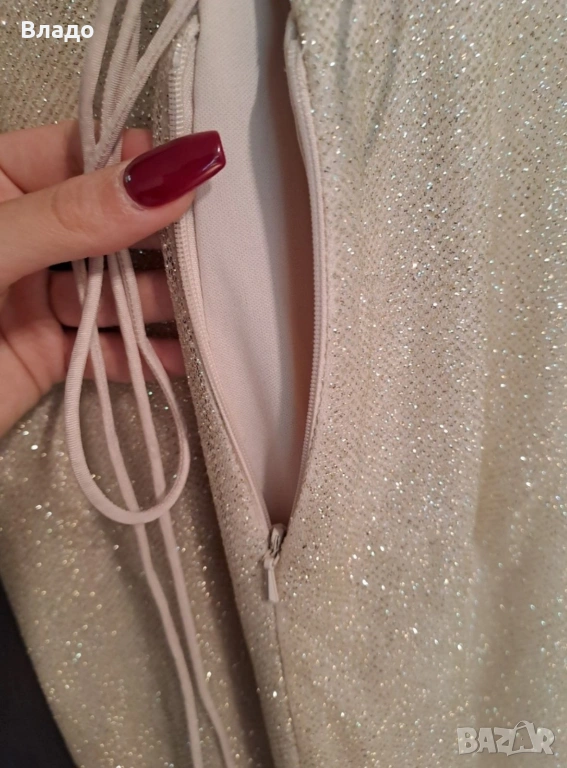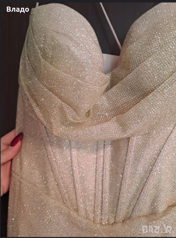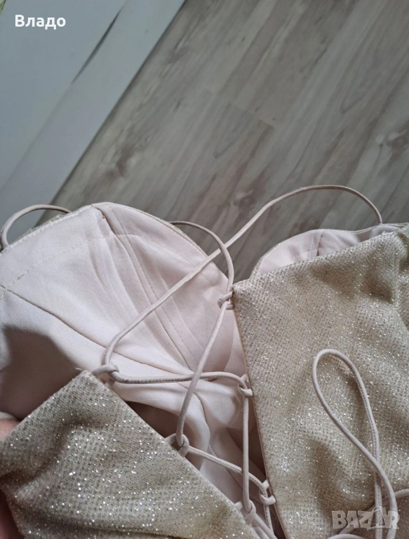 Блести, най-вече на слънце, горната част е тип корсет, връзва се отзад,