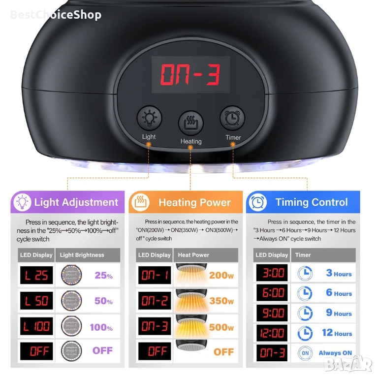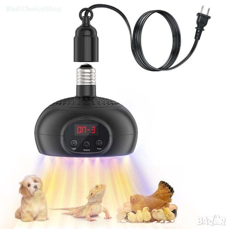 🌟【5-степенна функция за време】:Отоплителна лампа за кокошарник с вградена LED цифрова функция за време, вграден режим на време 3H-6H-9H-12H . Можете гъвкаво да регулирате цикъла на отопление според нуждите на различните ситуации. Може да показва предавката и времето за автоматично изключване, за да спести ненужни разходи за електроенергия.