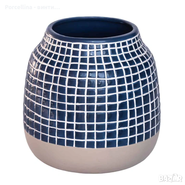 Керамична ваза синьо и бежово Елегантна керамична ваза с изразен релефен геометричен мотив