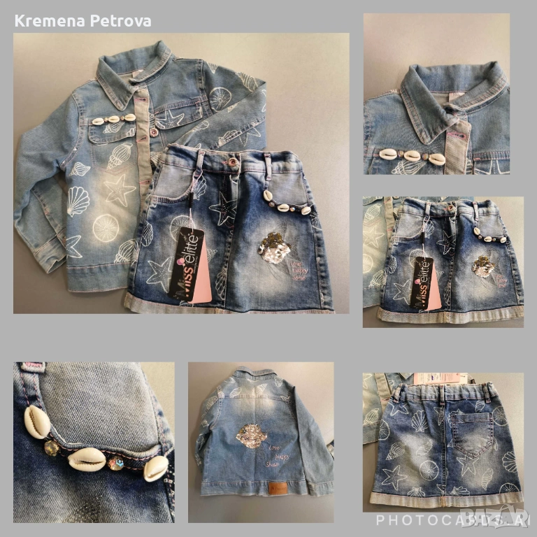 Снимка 6: Комплект от дънково яке и нова дънкова пола с мотиви на морски звезди и раковини, Miss Elite, 5години,110-116, 18,00€