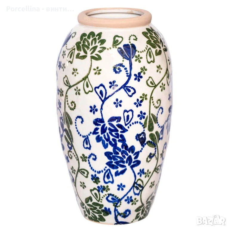 Тази елегантна керамична ваза впечатлява с ръчно изрисуван флорален мотив в синьо и зелено върху бяла основа, който придава артистичен и свеж акцент на всеки интериор. Класическата й форма и фино изработените детайли я правят подходяща както за модерен, така и за традиционен дом.