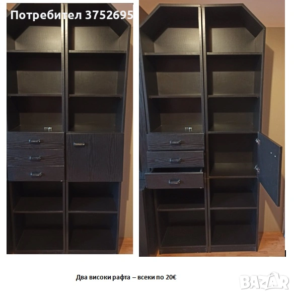 високи рафтове, всеки с размери: дължина-40,5 см., ширина-31см. Височина-204см