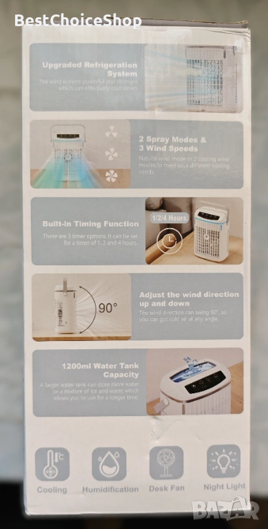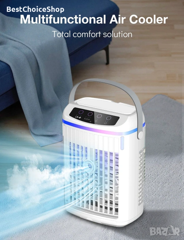 - 2025 ЪПГРЕЙД 4 В 1 МНОГОФУНКЦИОНАЛЕН ВЪЗДУШЕН ОХЛАДИТЕЛ Персоналният климатик служи като вентилатор, овлажнител и охладител на въздуха с елегантен дизайн. 1) Вентилатор: Създава силен въздушен поток за вентилация. 2) Овлажнител (добавете вода): Бори се със сухотата, подобрява влажността и облекчава сухата кожа. 3) Охладител на въздух (добавете ледена вода и кубчета лед): използва изпарение, за да осигури освежаваща и комфортна среда.