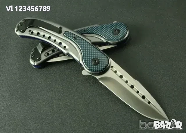 . Дръжката е от стомана с титаново сиво покритие. Ножа е снабден с подпружинен механизъм и пластина за блокиране на острието в отворено положение. Ръкохватката е много качествено изработена и се отличава с ергономичност и стабилност даваща много добър захват.