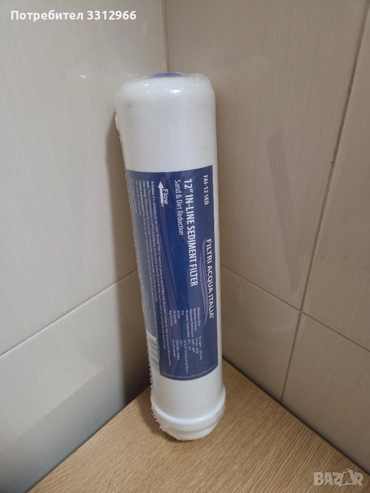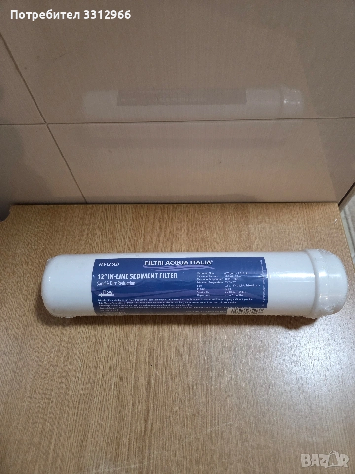 Чисто нов линеен седиментен филтър на марката Filtri Acqua Italia (модел FAI-12 SED). Предназначение: Механично пречистване на вода от пясък, ръжда и замърсявания. Размери: 2.5 x 12 инча (приблизително 6.35 x 30.48 см). Филтрация: Степен на филтриране 5 микрона. Капацитет: Проектиран за дебит до 2000 галона (около 7570 литра).