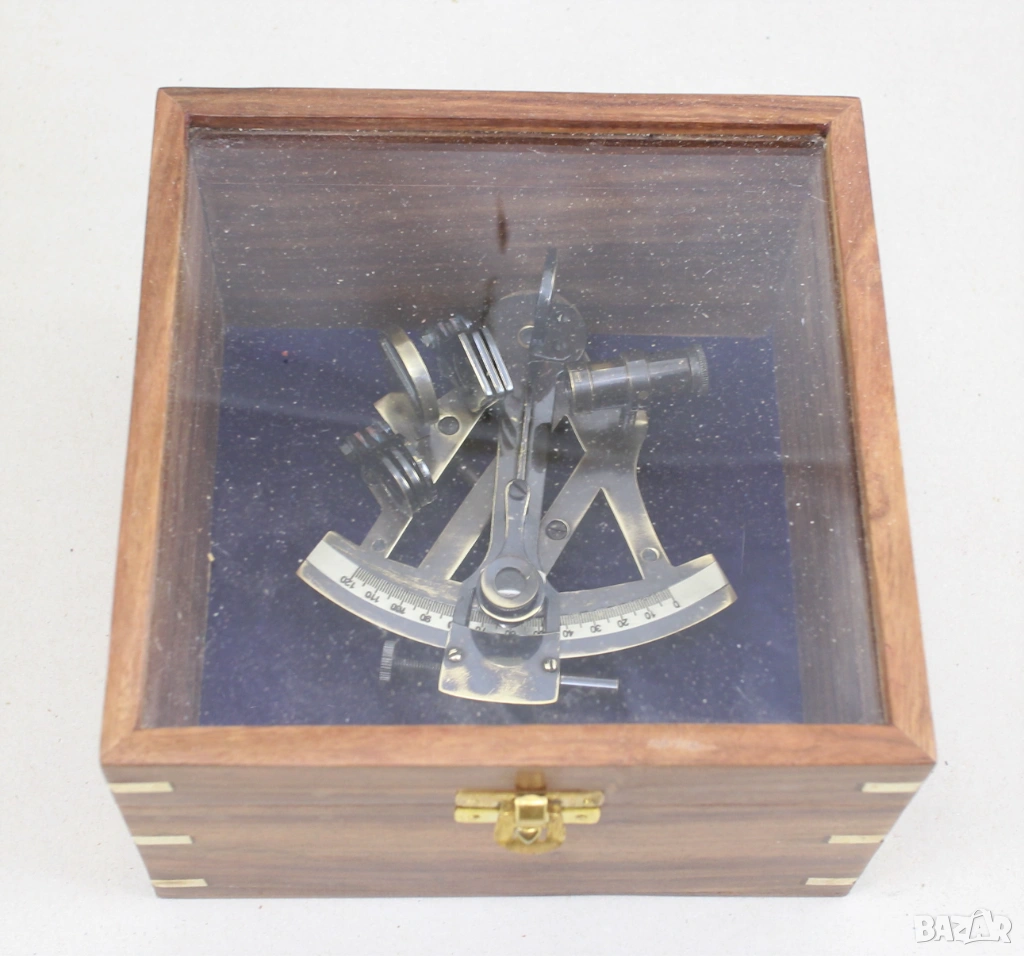 Корабен секстант античен в дървена кутия от палисандрово дърво със стъклен капак. Секстанта е изработен от плътен месинг. Размер на секстанта-ширина-12см; височина- 13.см.Кутията е изработена от палисандрово дърво.Размери-17 см х 17.см.