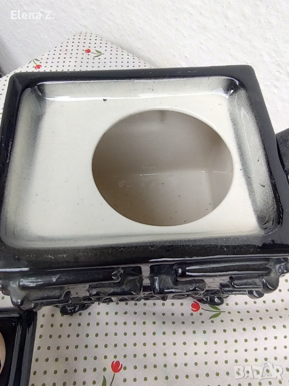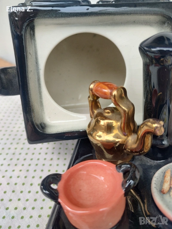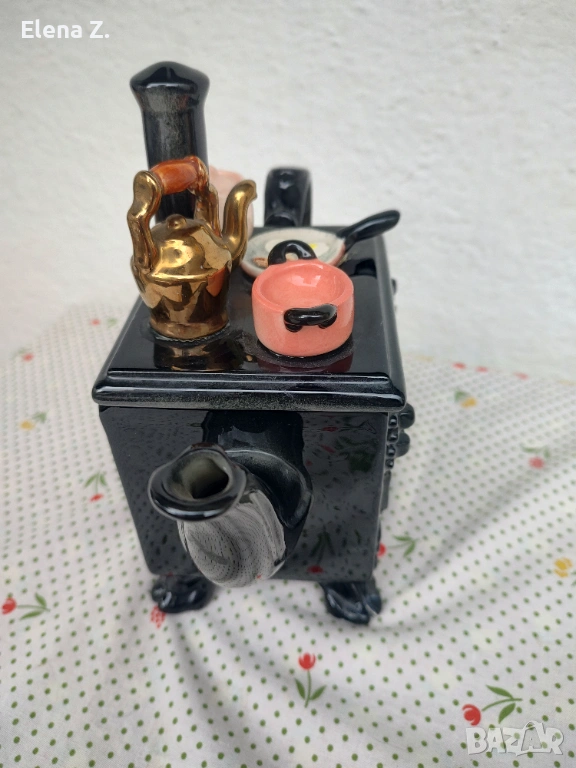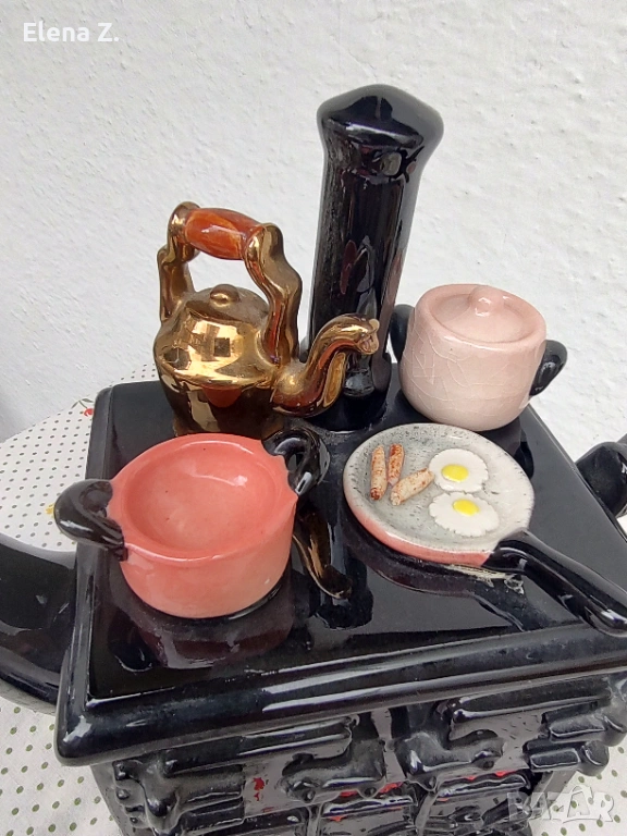 Изработен е ръчно във формата на стара лъскава черна печка Ага на дърва, като на котлоните има чудесни съдчета за приготвяне на английска закуска - тиган с яйца и кренвирши, тенджерка, касеролка и чайник.