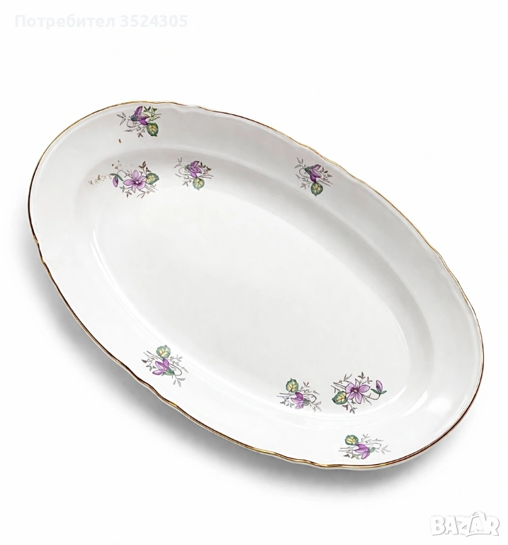 Тази красива порцеланова чиния е подходяща за сервиране на месни ястия. Украсена е с изящни цветя в лилаво и зелено, които придават елегантен и изтънчен вид. Чинията е в отлично състояние и може да бъде използвана за всекидневна употреба или за специални случаи.