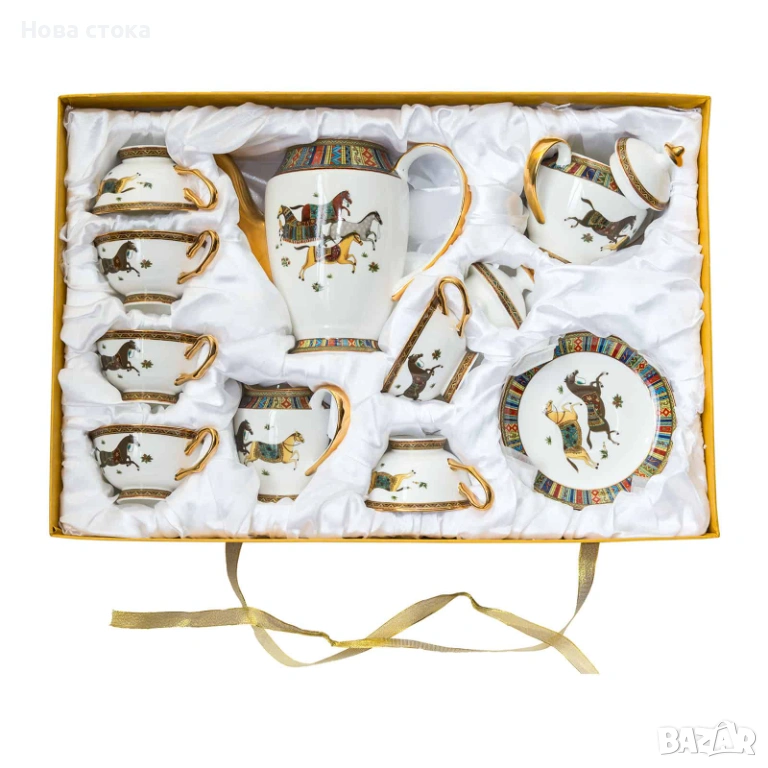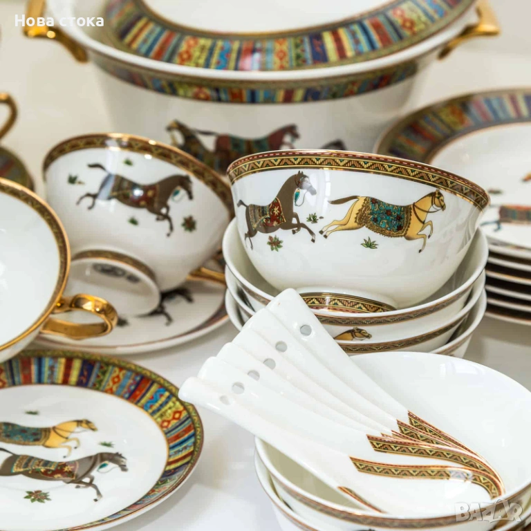 Сервиз Hermes, изработен от висококачествен китайски порцелан, със златен кант, изкусно украсени орнаменти и символ на кон.