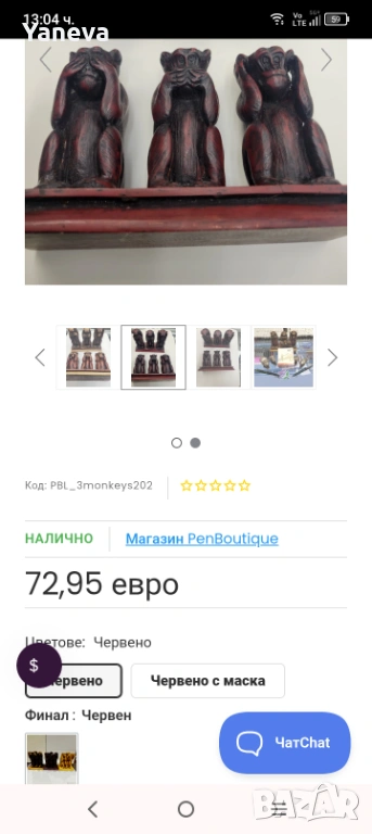 Трите мъдри маймуни , символизиращи фразата „не виждам зло, не чувам зло, не говоря зло“. Размер 17 см , цена 40 € .
