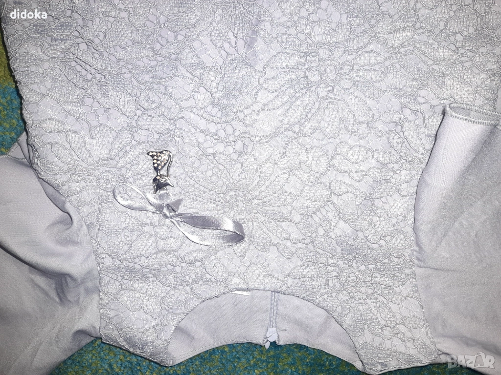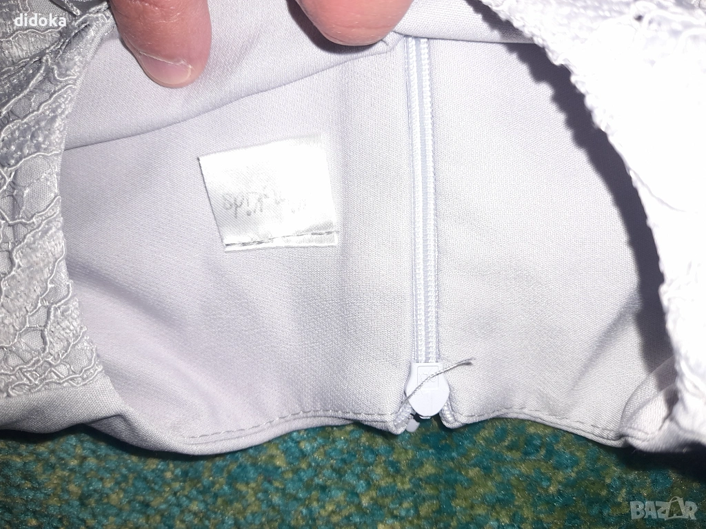 Красива рокля отпред е дантела, а отзад е изчистена, цветът е светло сива