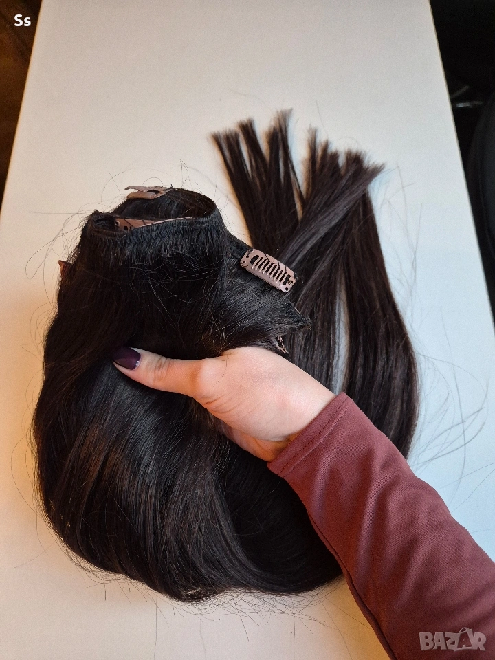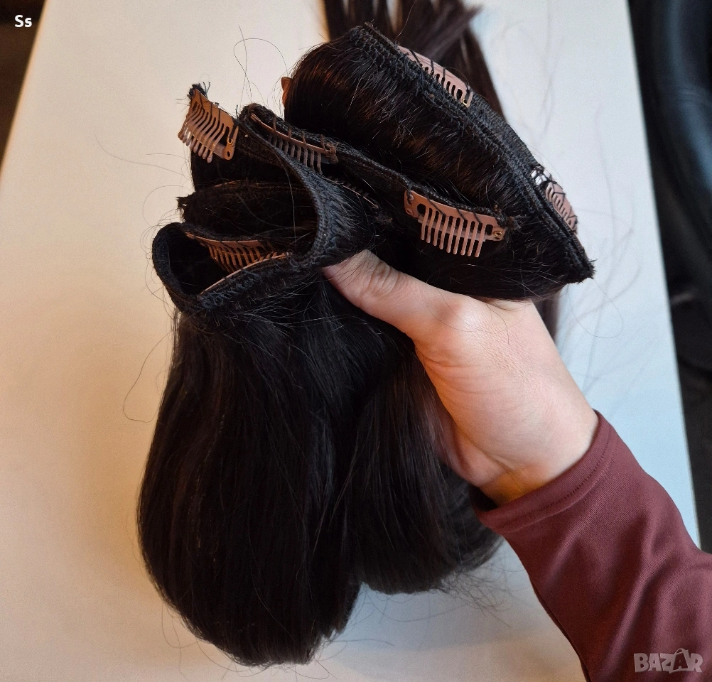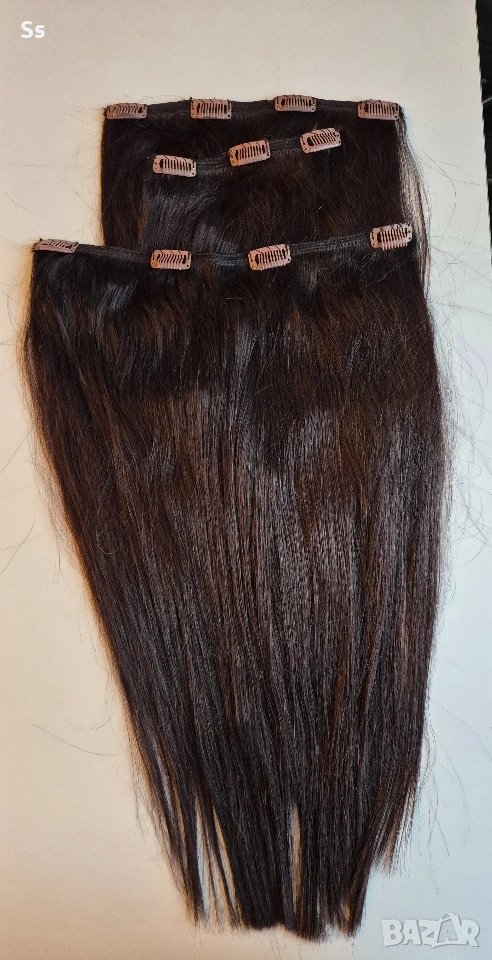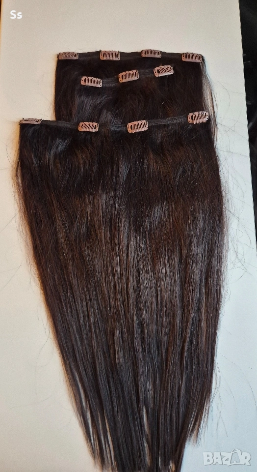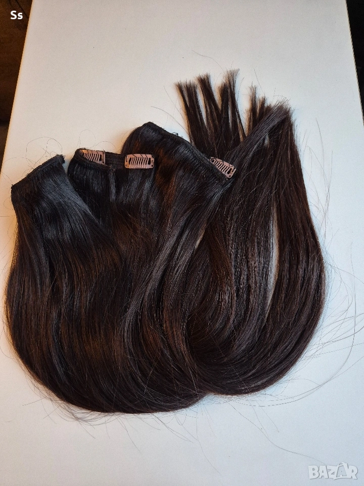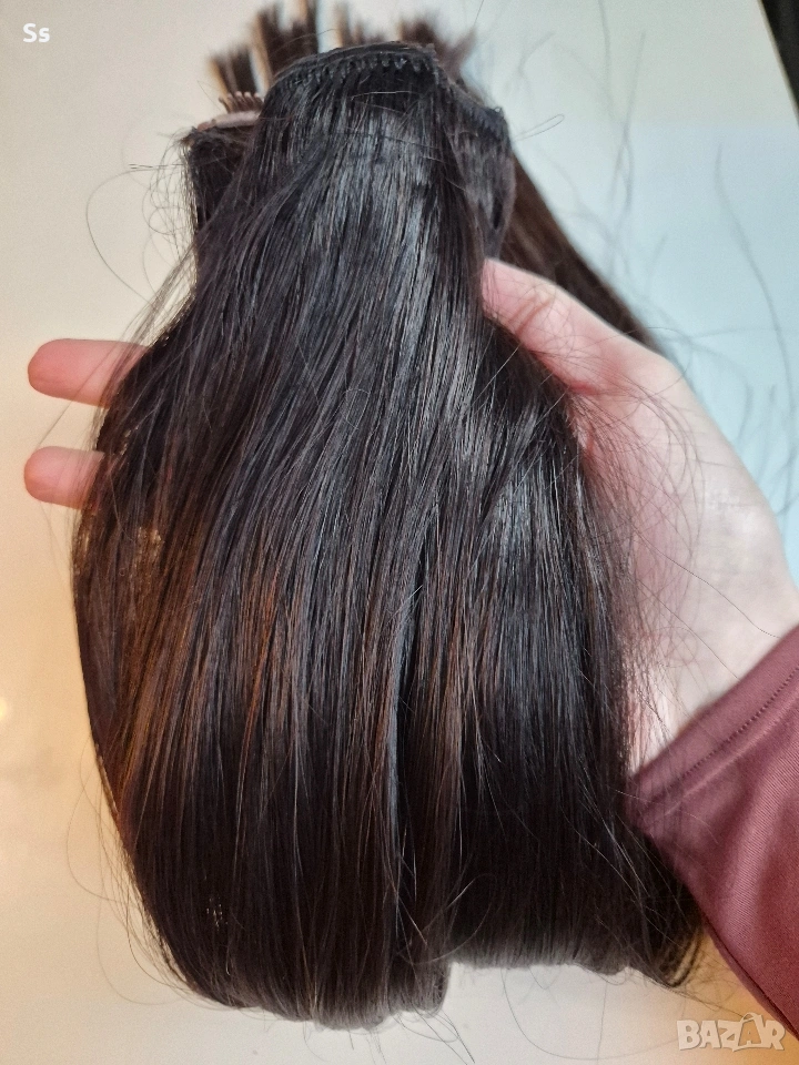 Косата е 150гр.50-53см.плътен косъм достатъчно количество да уплътни и удължи къса коса. Тресата е ушита в три тройни реда с щипки, готова за поставяне. Цвета е тъмно кестеняв отговоря на 5.0 като цвят. Косата може да се боядисва и третира с топлинни уреди до 180 градуса.