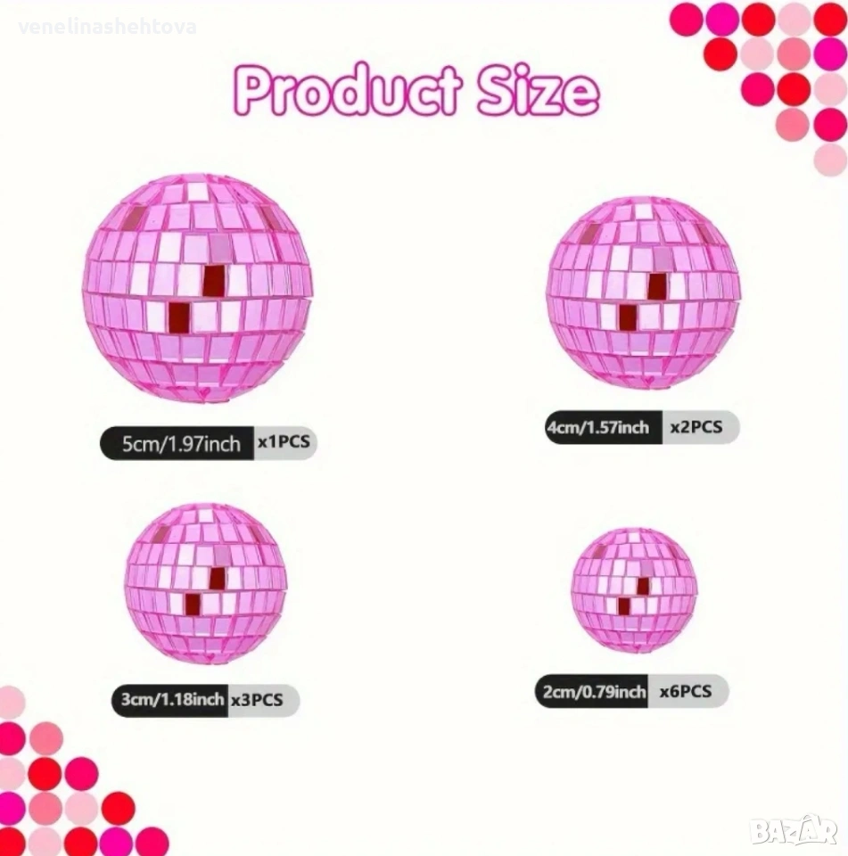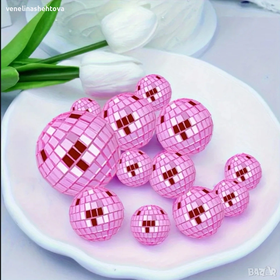 12 броя светло розови огледални диско топки за декорация на торта → Обява 54010220
